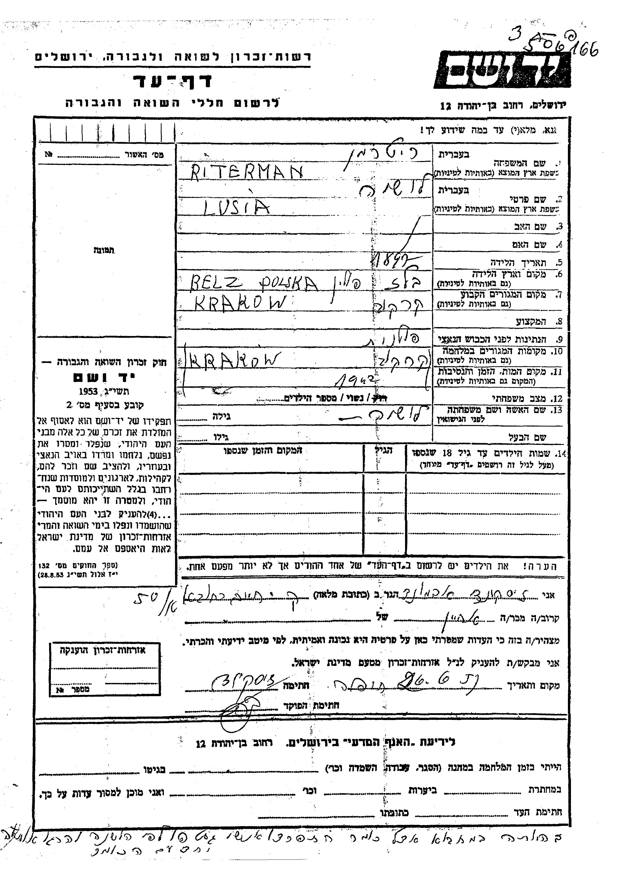 Riterman Lusia Lusha 1897 Krakow, Polonia Hoja de Testimonio