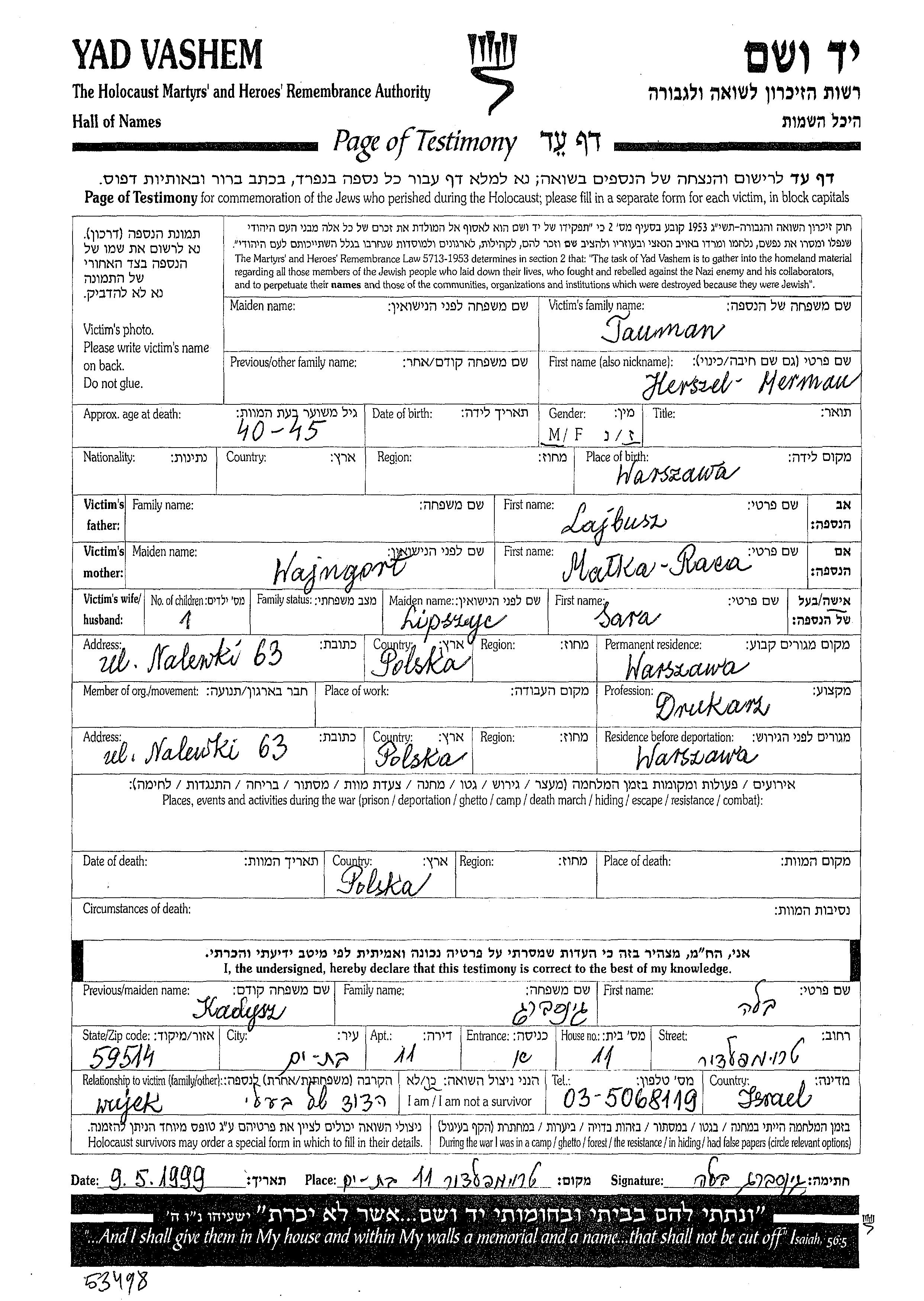 Taumann Herszel Herman Warszawa, Polonia Hoja de Testimonio