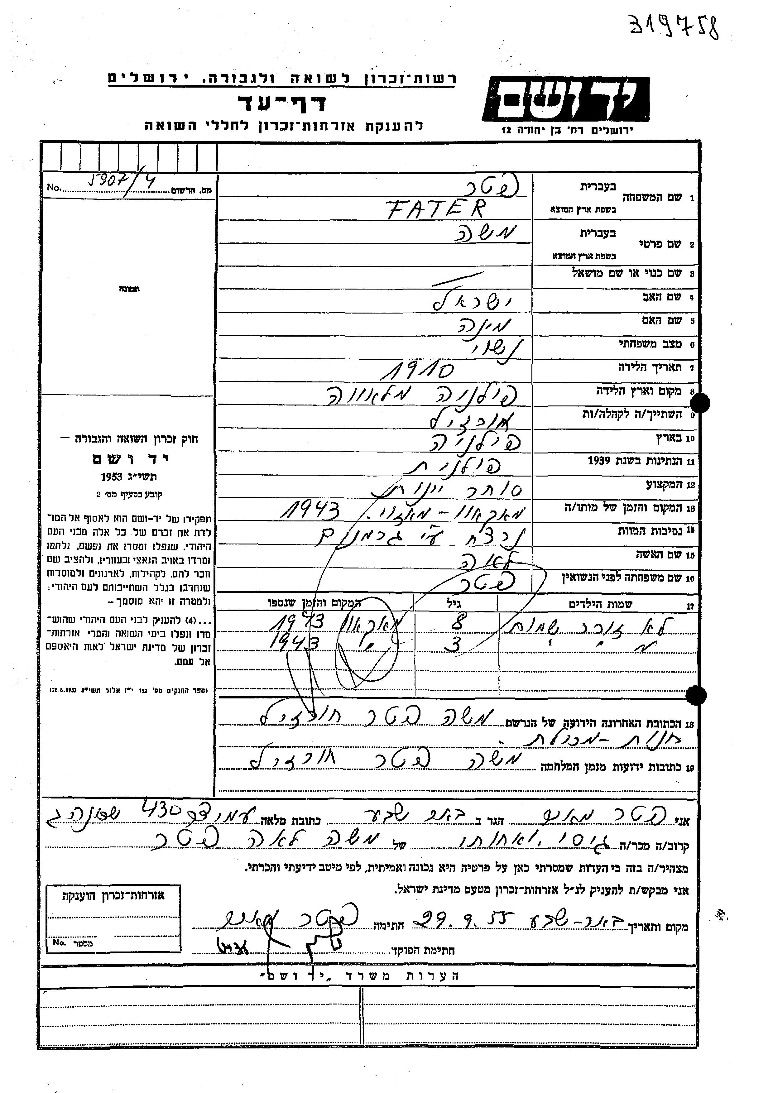 Fater Moshe 1910 Khorzel, Polonia Hoja de Testimonio