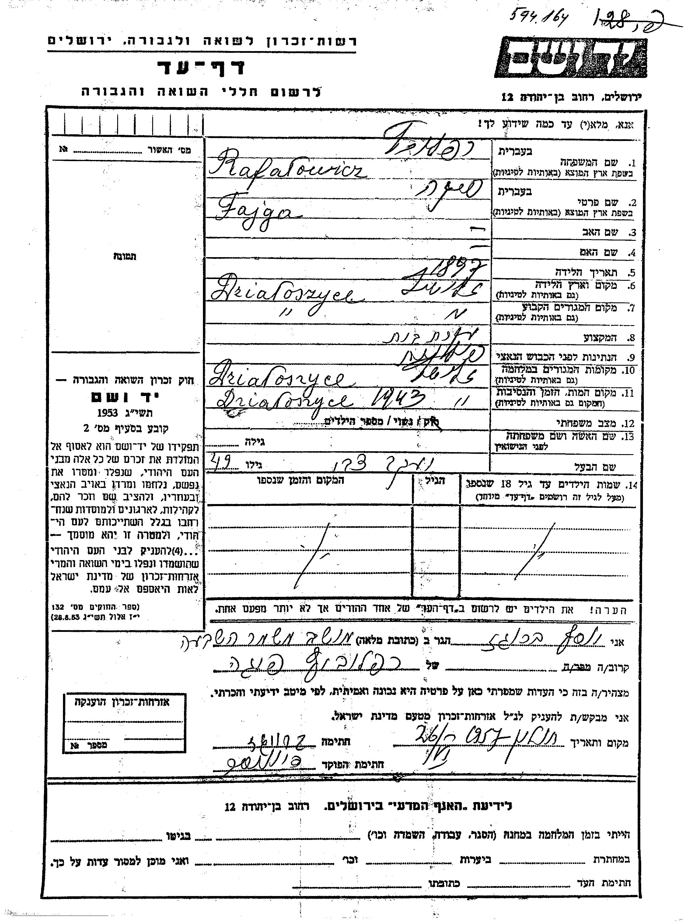 Fajga Rafalowicz nació en Dzialoszyce, Polonia en 1897. Era Ama de casa y casada con Yaakov Tzvi. Antes de la segunda guerra mundial vivía en Dzialoszyce, Polonia. Durante la guerra estuvo en Dzialoszyce, Polonia.