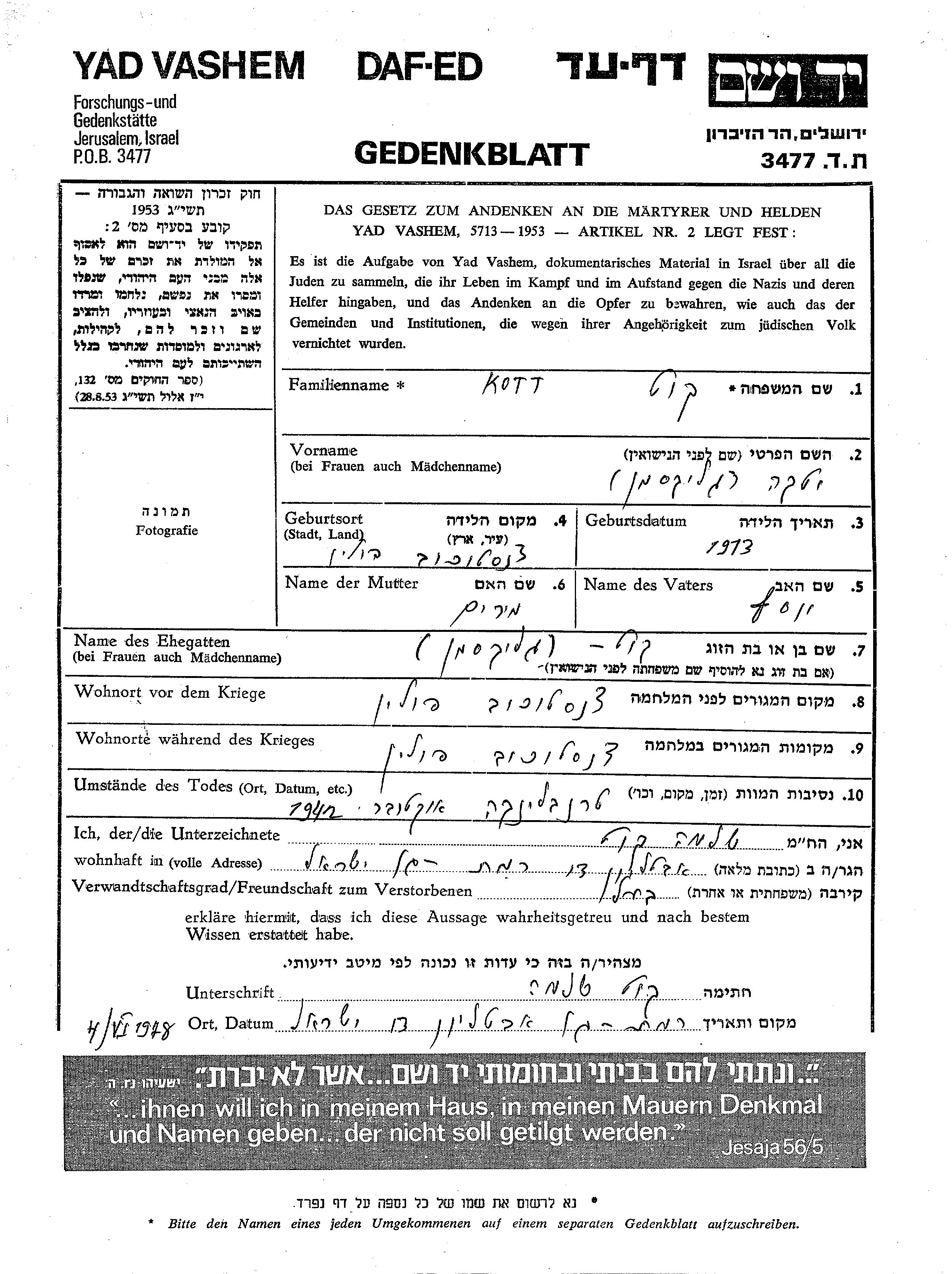 Itka Kott apellido de soltera Gliksman nació en Czestochow, Polonia en 1913, hija de Yosef y Miriam. Era casada con Shlomo. Antes de la segunda guerra mundial vivía en Czestchow, Polonia. Durante la guerra estuvo en Czestchow, Polonia.
