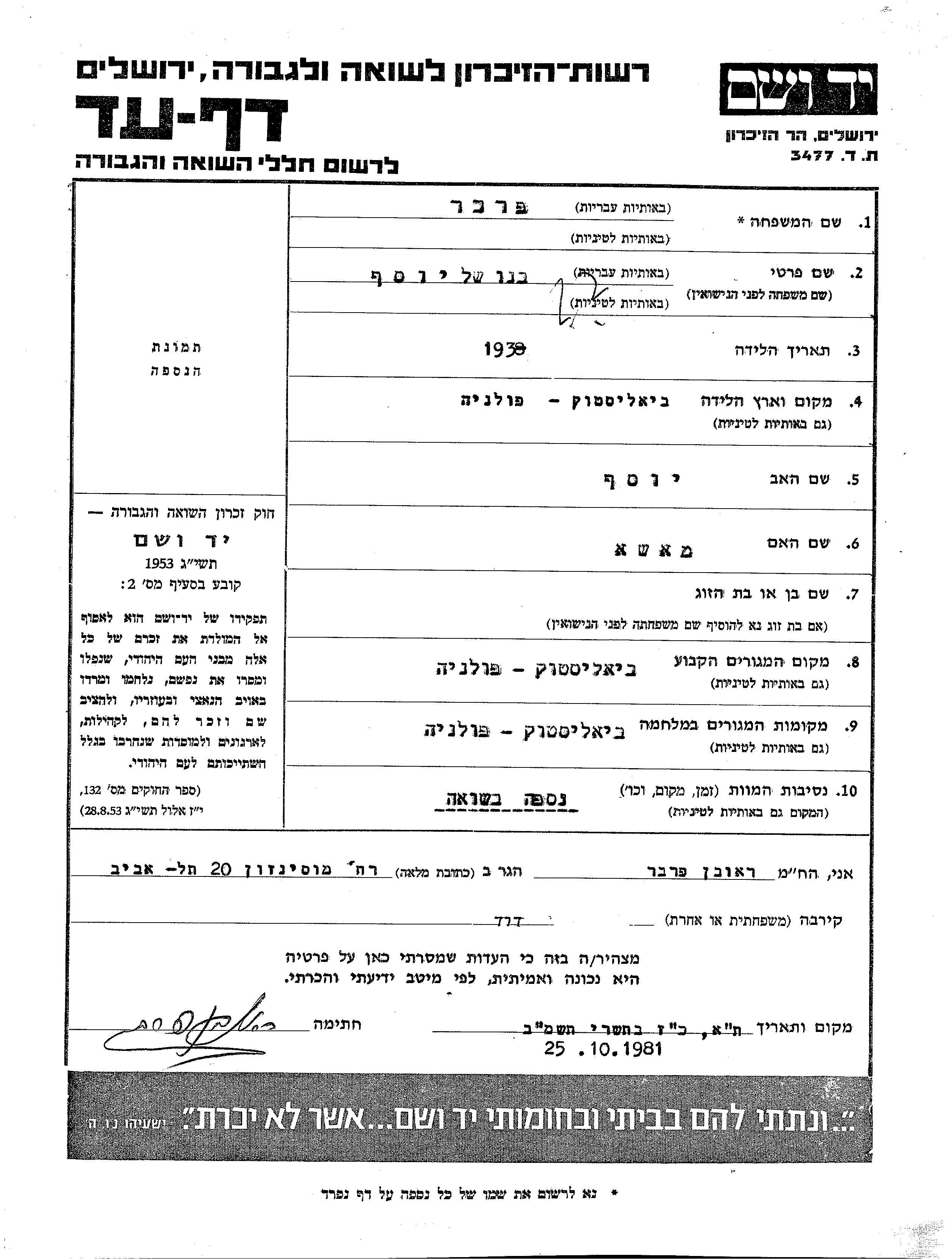 Ferber nombre desconocido 1938 Bialystok, Polonia Hoja de Testimonio