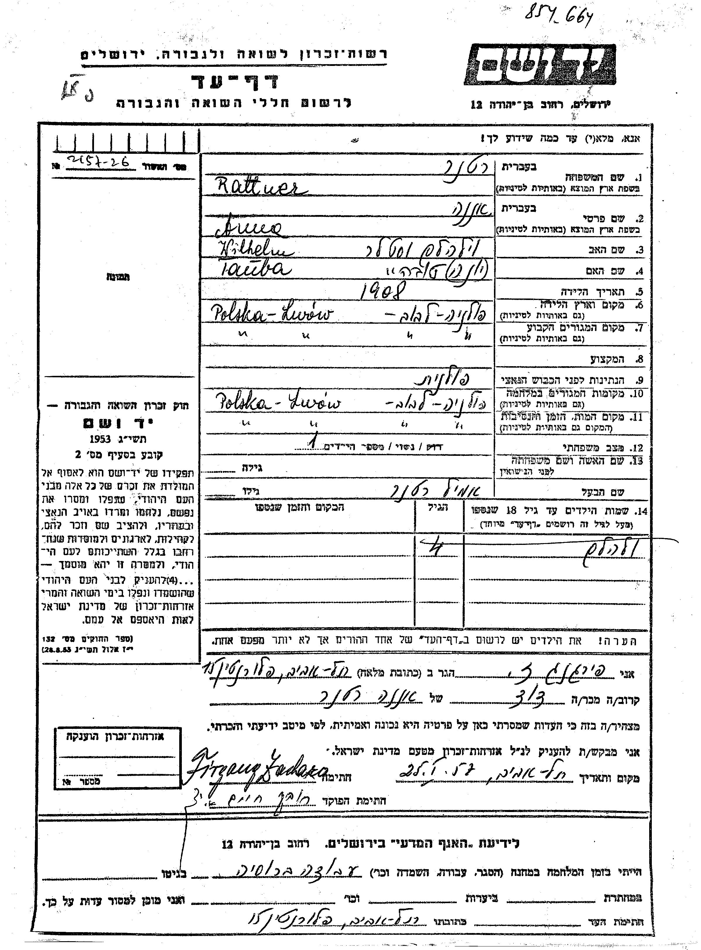 Rattner Anna 1908 Lwow, Polonia Hoja de Testimonio