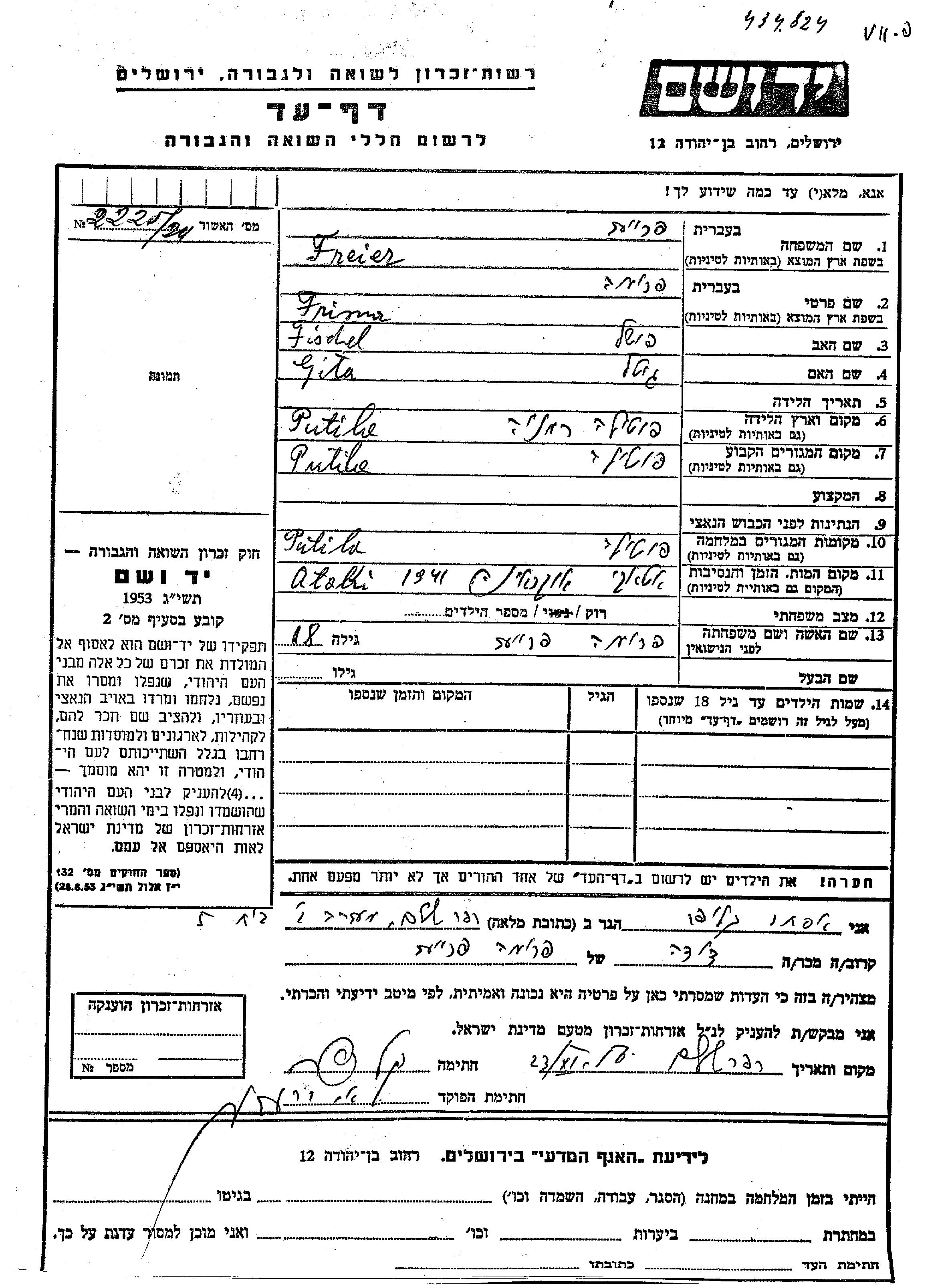 Freier Frima Putila, Rumania Hoja de Testimonio