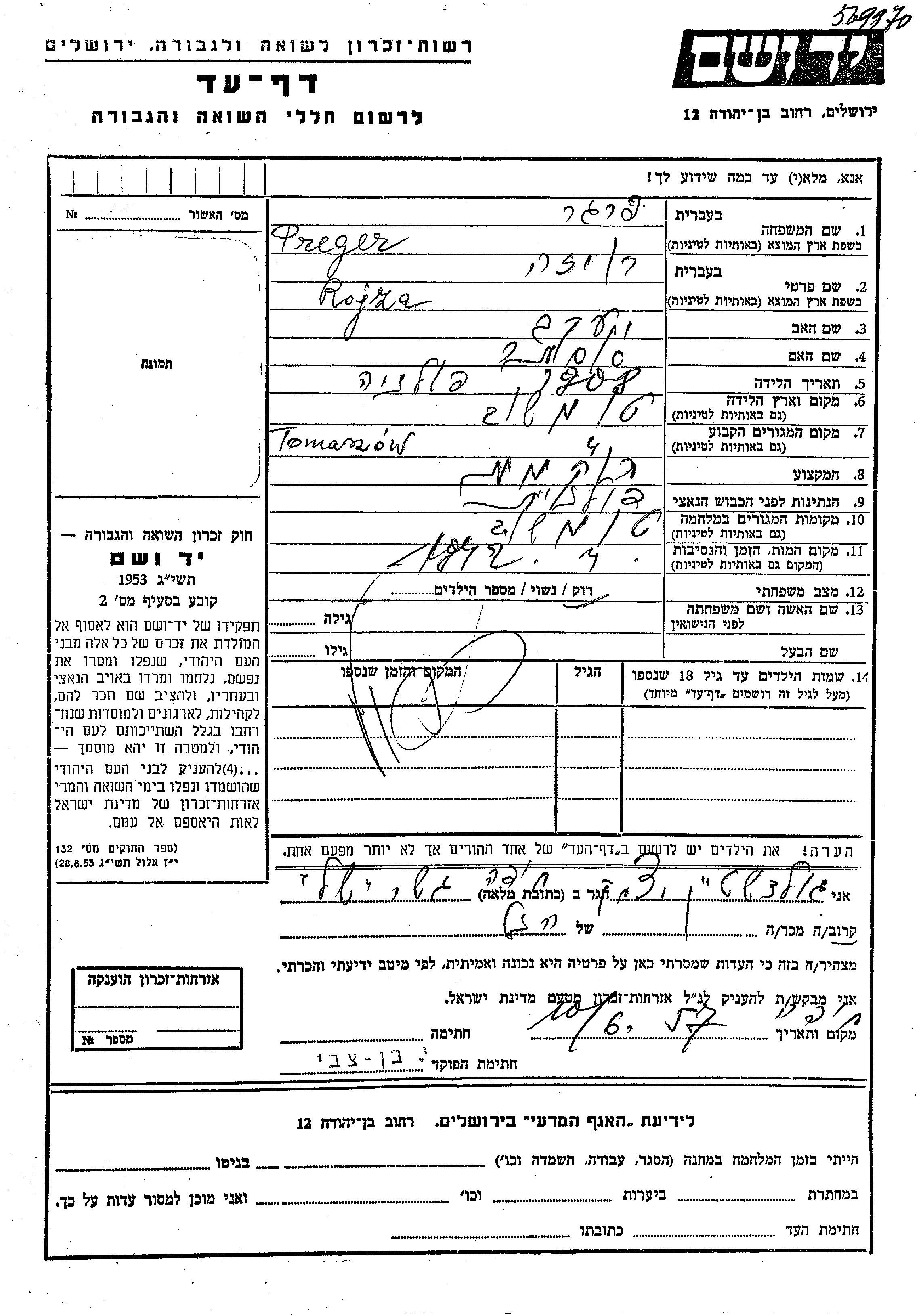Preger Rojza 1908 Tomaszow, Polonia Hoja de Testimonio