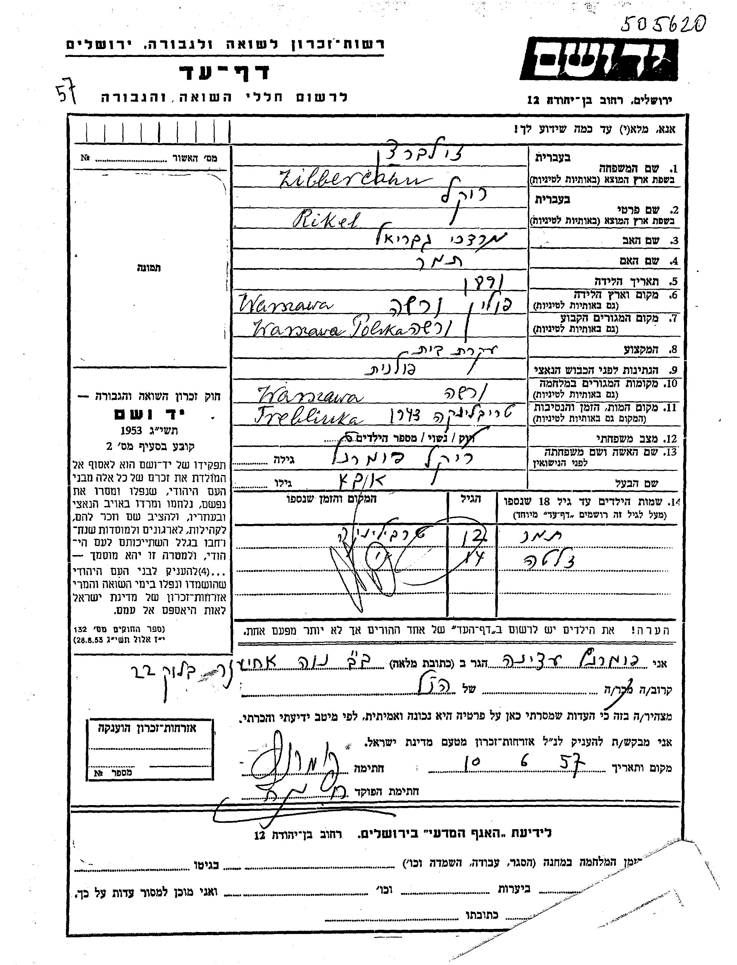 Rikel Zilbercahn apellido de soltera Pomerantz nació en Warszawa, Polonia en 1897, hija de Mordekhai Gabriel y Tamar. Era Ama de casa y casada con Aba. Antes de la segunda guerra mundial vivía en Warszawa, Polonia. Durante la guerra estuvo en Warszawa, Polonia.