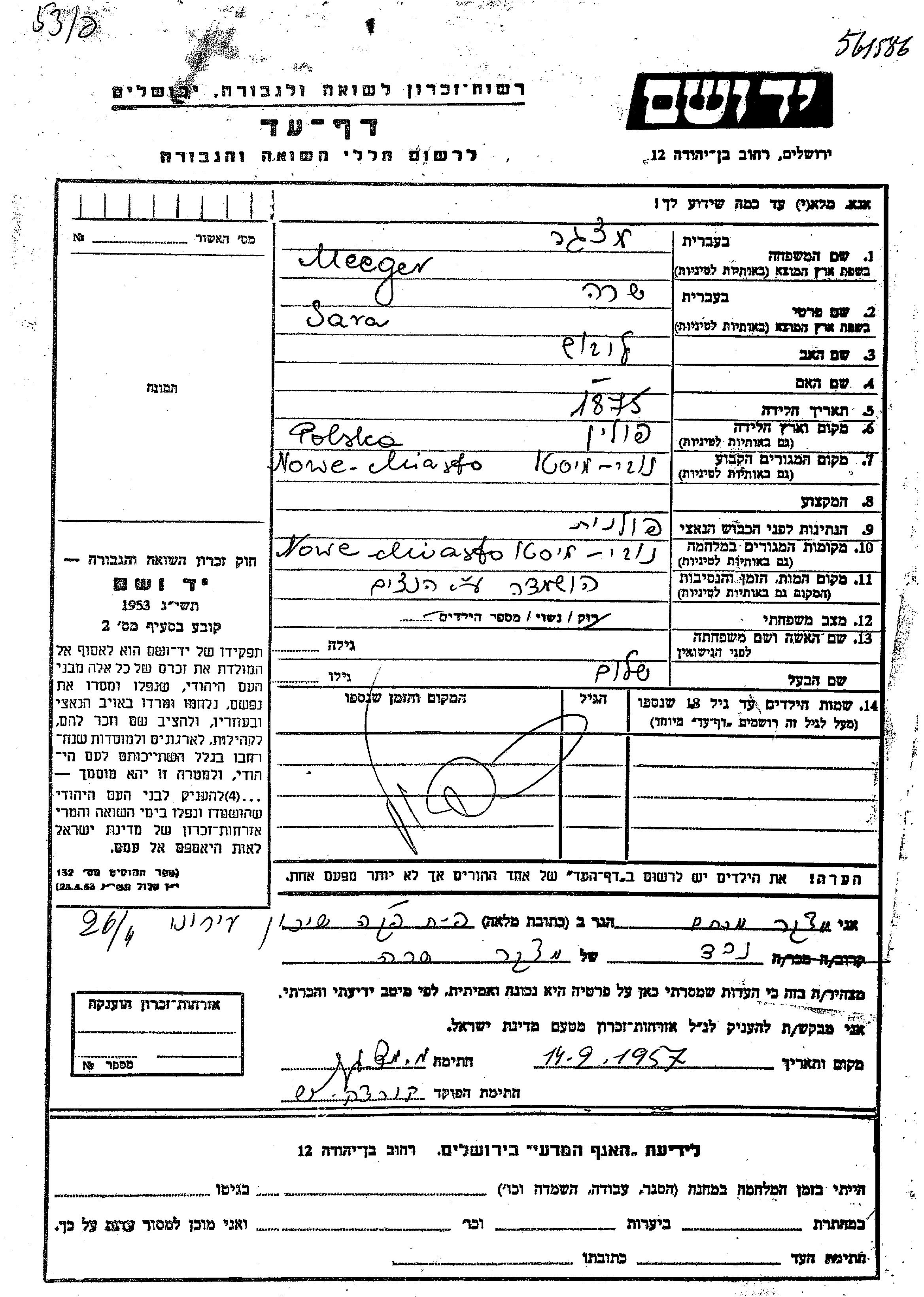 Sara Mecger nació en Polonia en 1875, hija de Leibush. Era casada con Shalom. Antes de la segunda guerra mundial vivía en Nowe Miasto, Polonia. Durante la guerra estuvo en Nowe Miasto, Polonia.