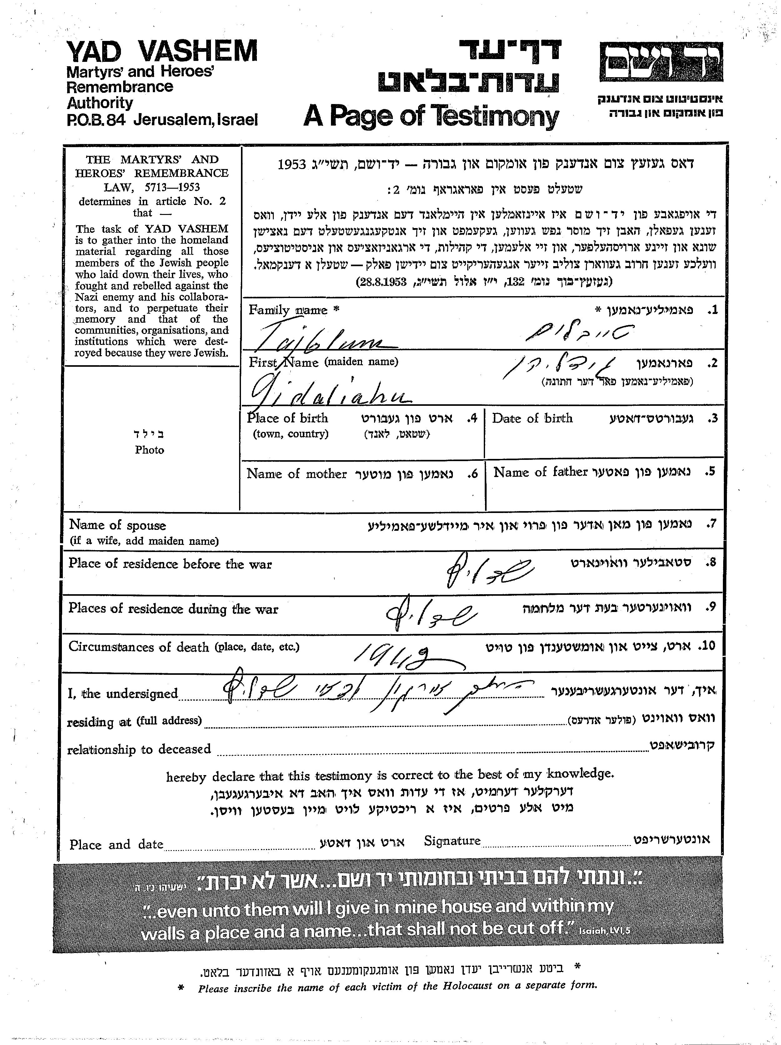 Gidaliahu Tajblum. Antes de la segunda guerra mundial vivía en Siedlce, Polonia. Durante la guerra estuvo en Siedlce, Polonia.