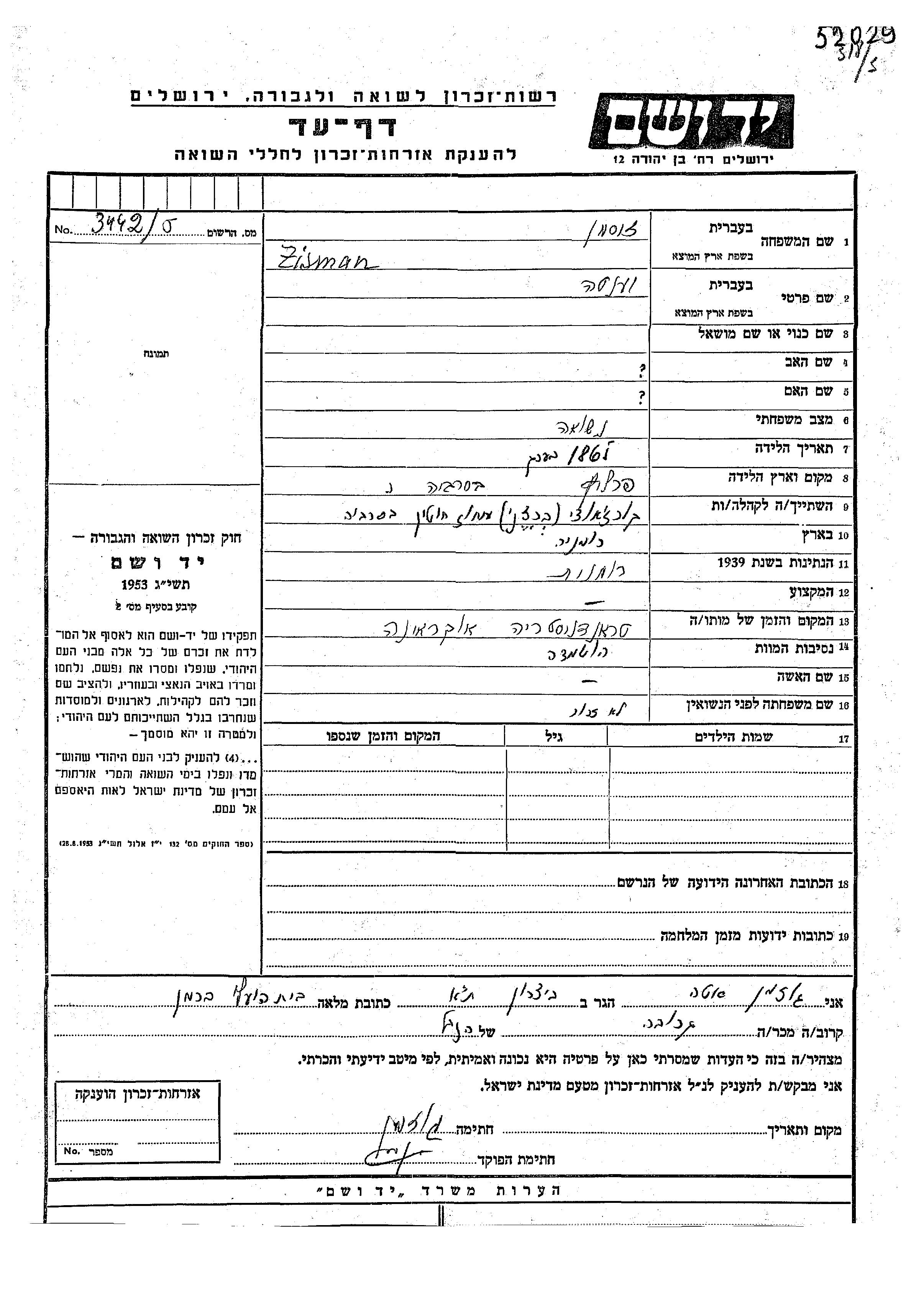 Zisman Yenta 1865 Berezina, Rumania Hoja de Testimonio