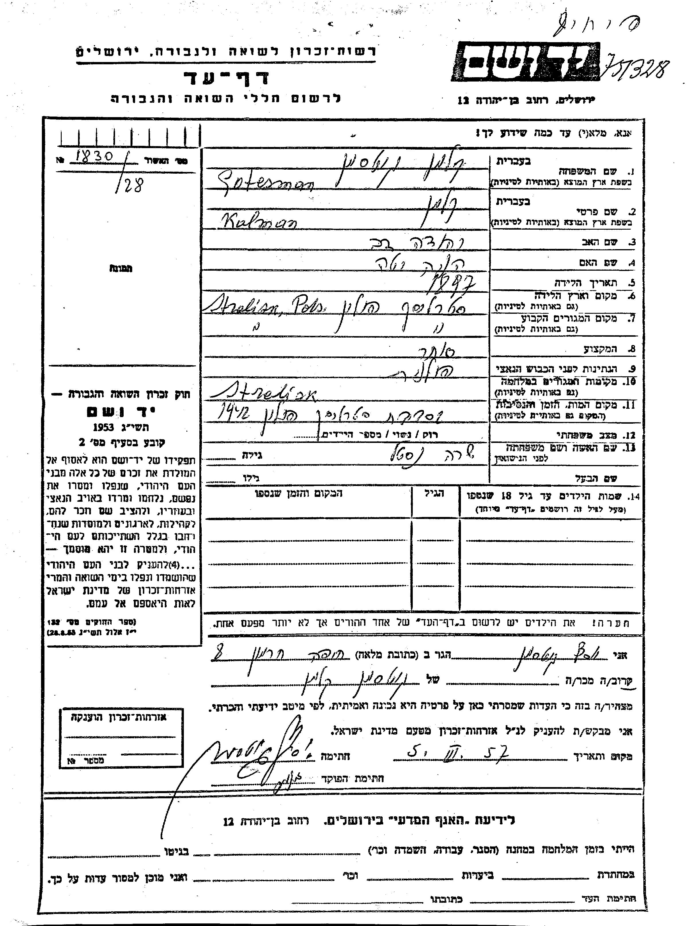 Kalman fue asesinado durante la Shoá. Lugar de la muerte: Strelisk, Polonia en 1942.