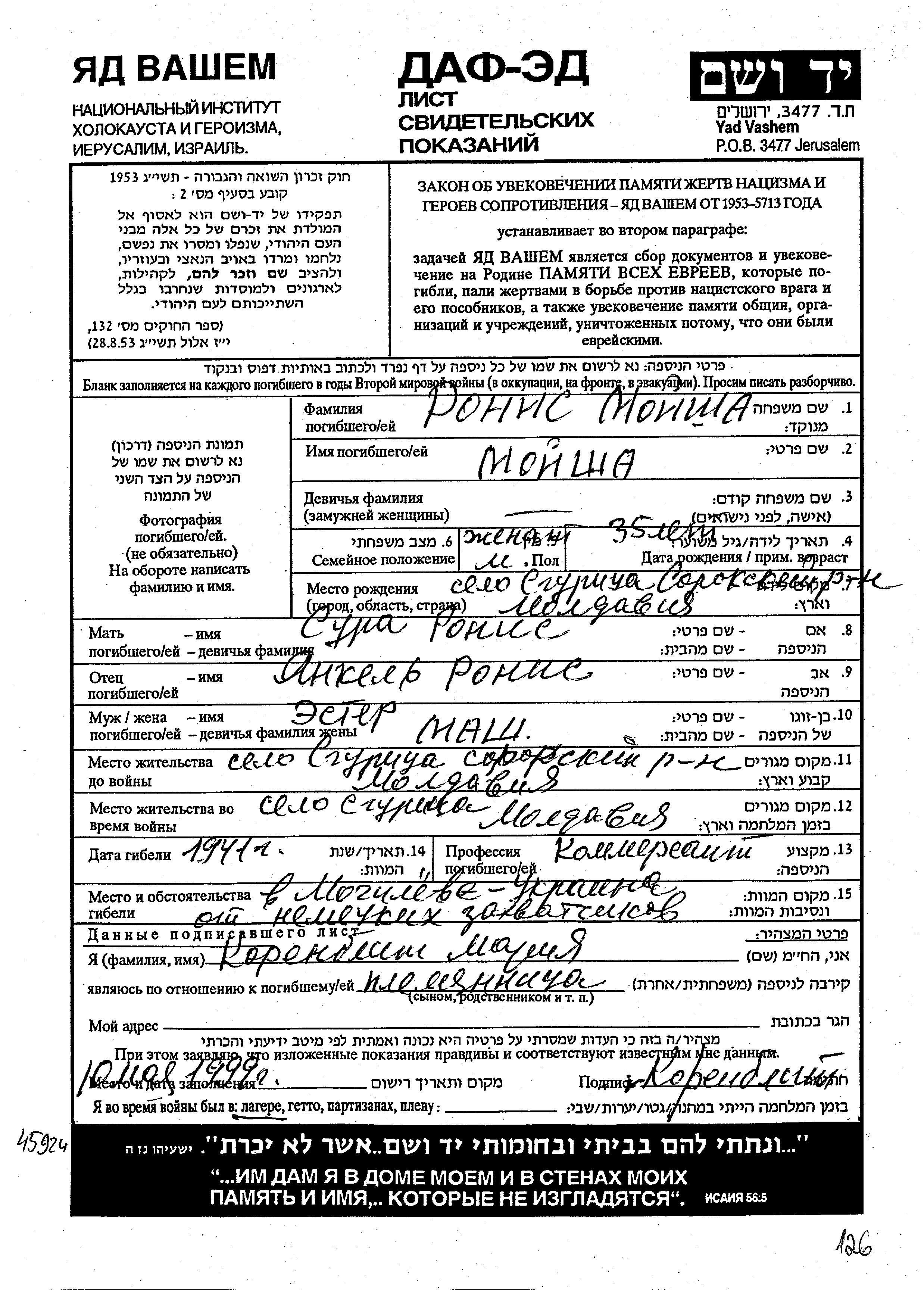 Ronis Moisha Sgurita, Rumania Hoja de Testimonio