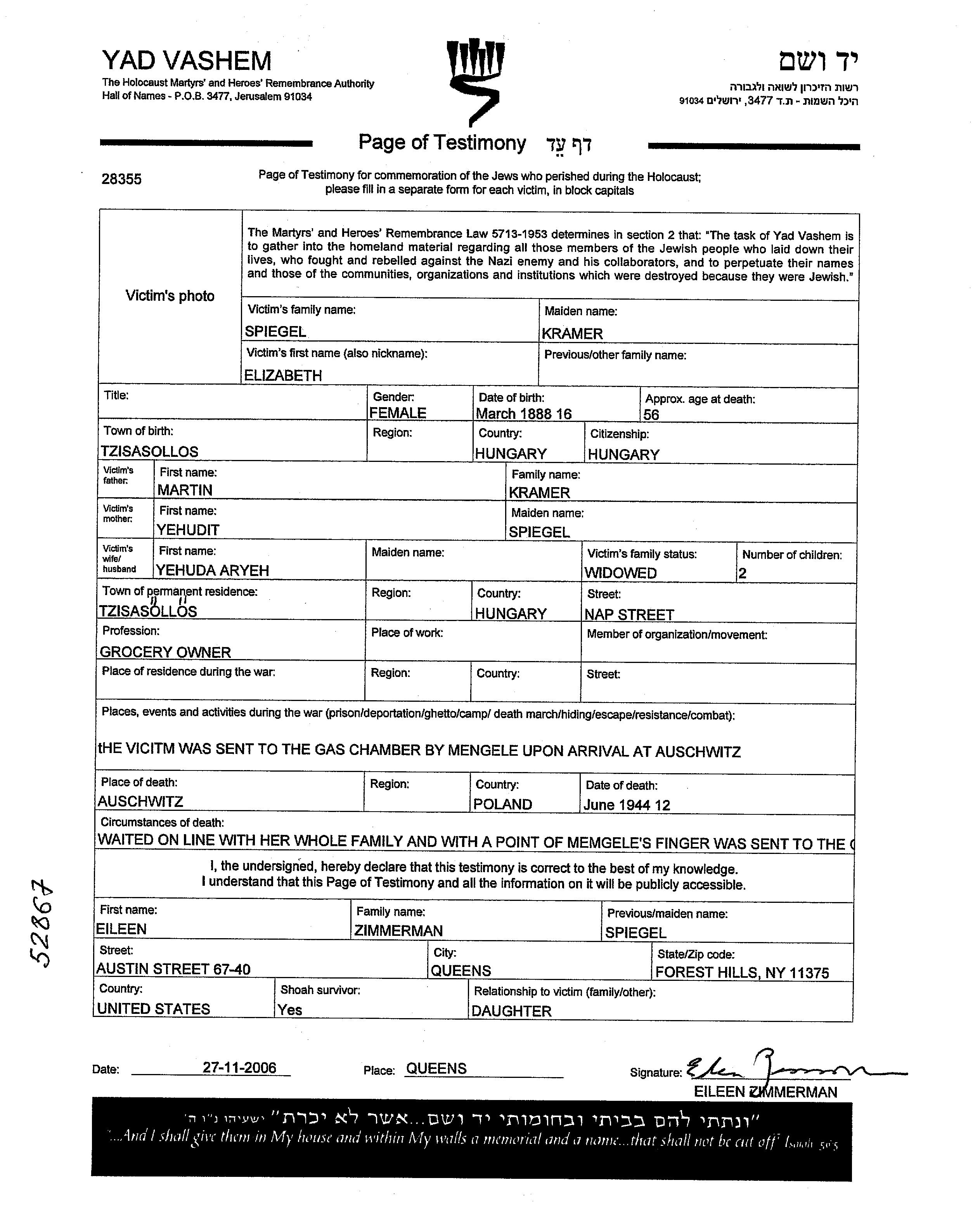 Elizabeth Spiegel apellido de soltera Kramer nació en Tisasollos, Hungría en 1888, hija de Martin y Yehudit apellido de soltera Spiegel. Era Dueño/a de tienda de comestibles y Viudoa con Yehuda Aryeh. Antes de la segunda guerra mundial vivía en Tisasollos, Hungría. Elizabeth fue asesinada durante la Shoá. Lugar de la muerte: Auschwitz, Polonia en 12/06/1944.