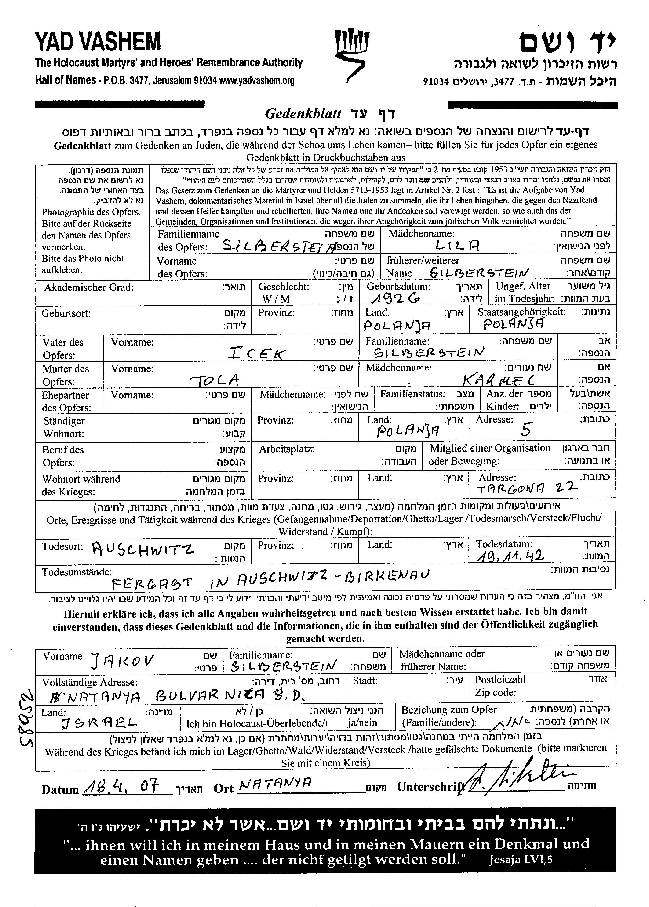 Silberstein Lila 1926 Polonia Hoja de Testimonio