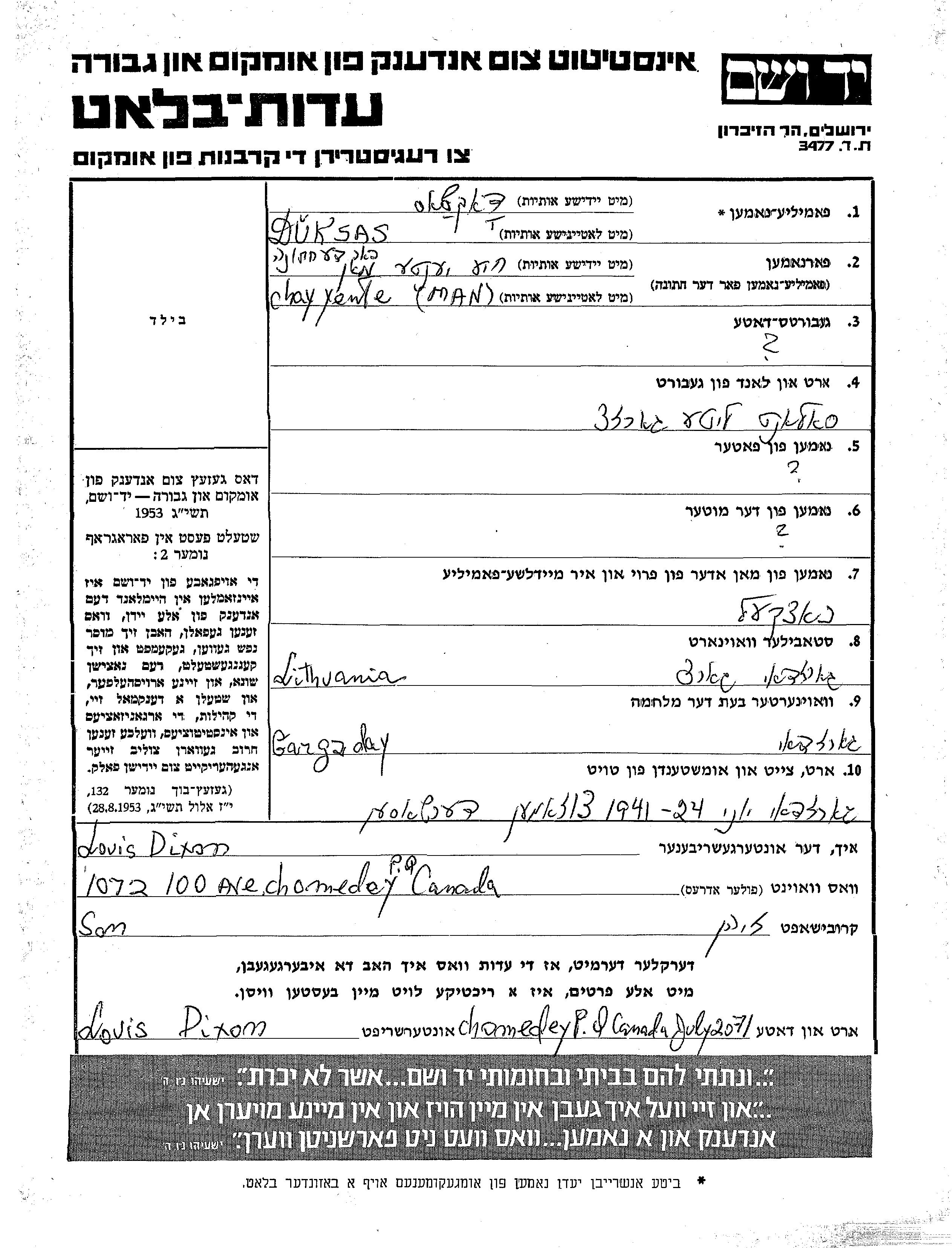 Duksas Chay Yente Gargždai, Lituania Hoja de Testimonio