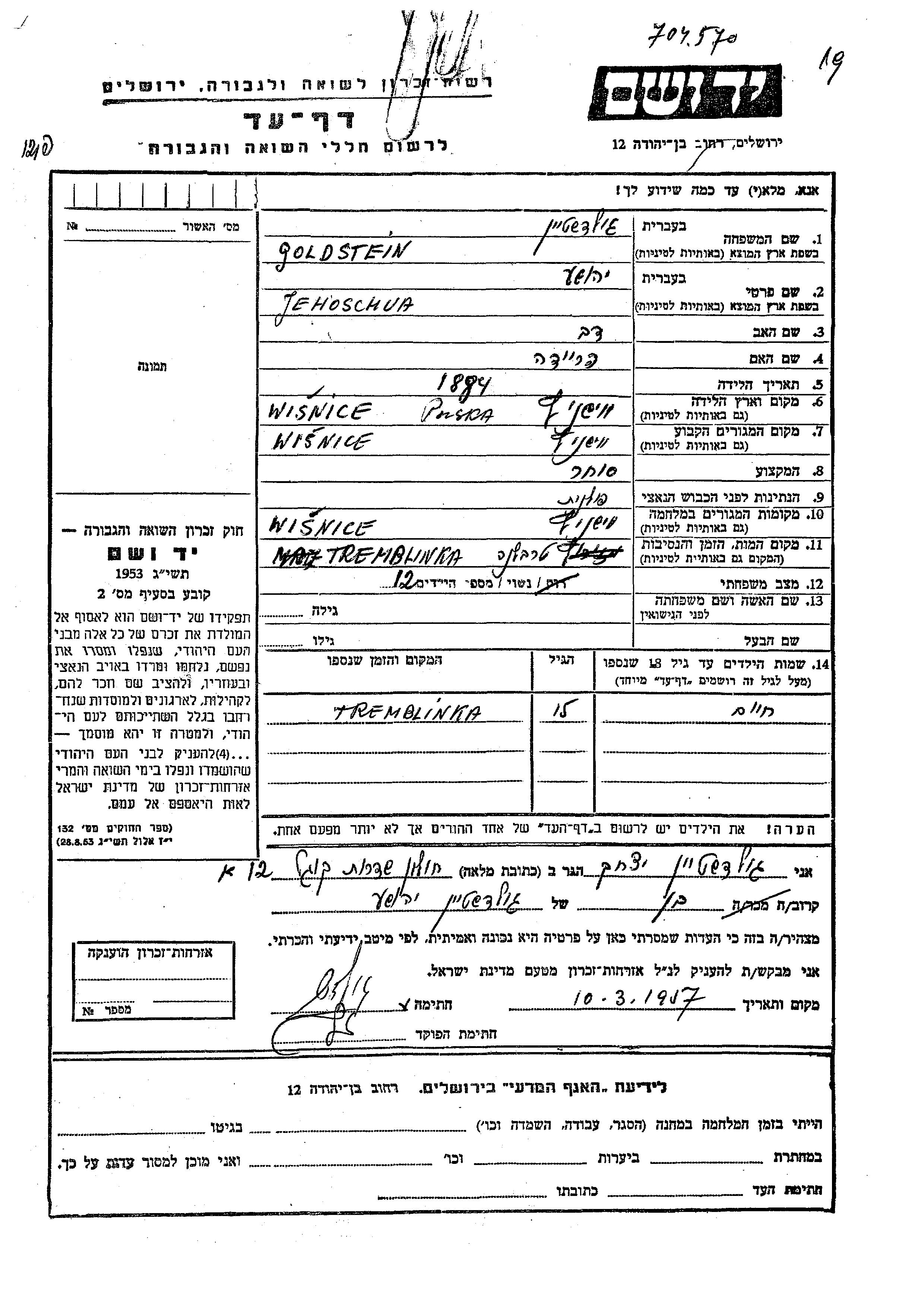 Goldstein Jehoschua 1884 Wisnicz, Polonia Hoja de Testimonio