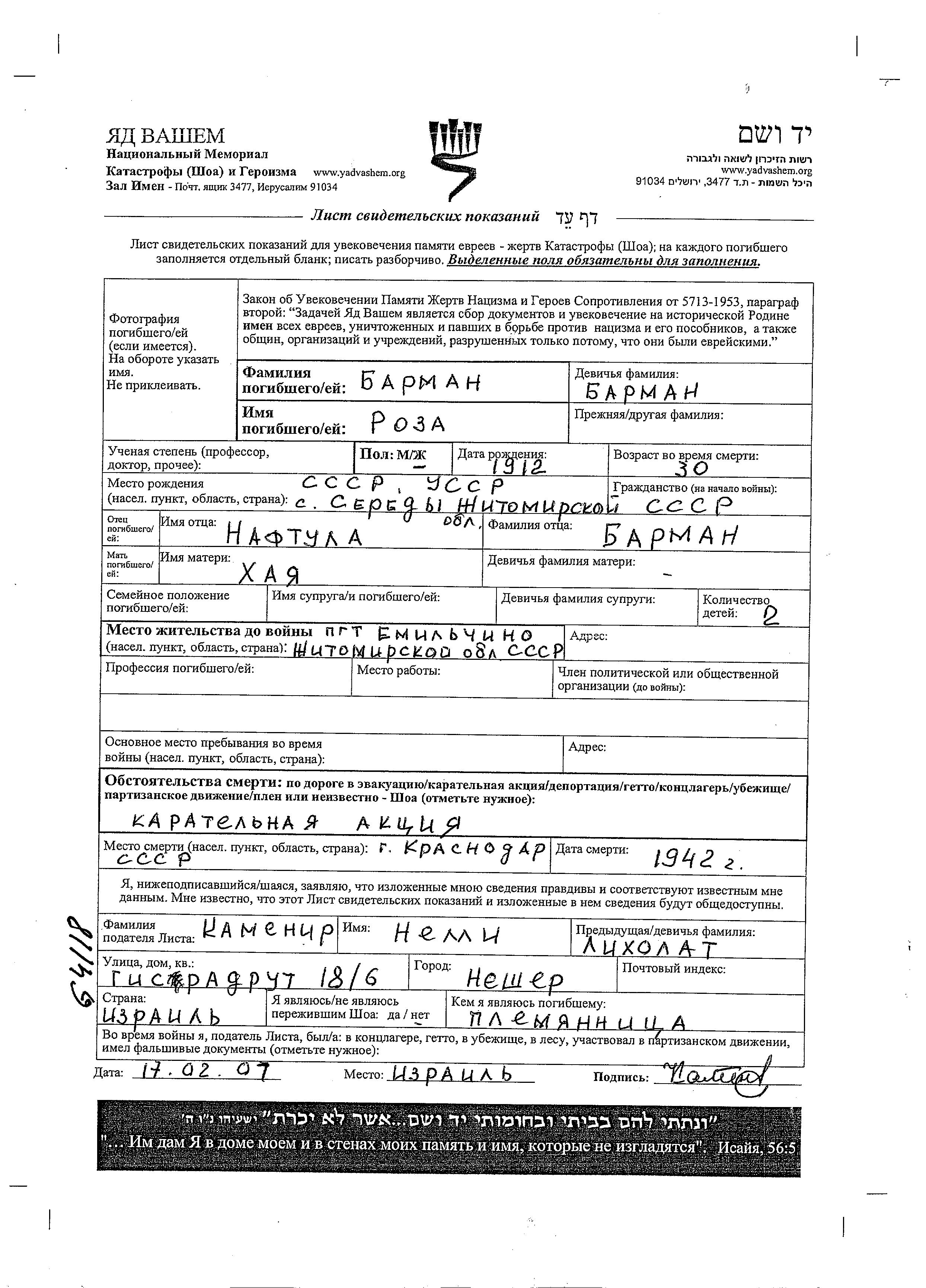 Barman Roza 1912 Yemilchino, Ucrania (URSS) Hoja de Testimonio