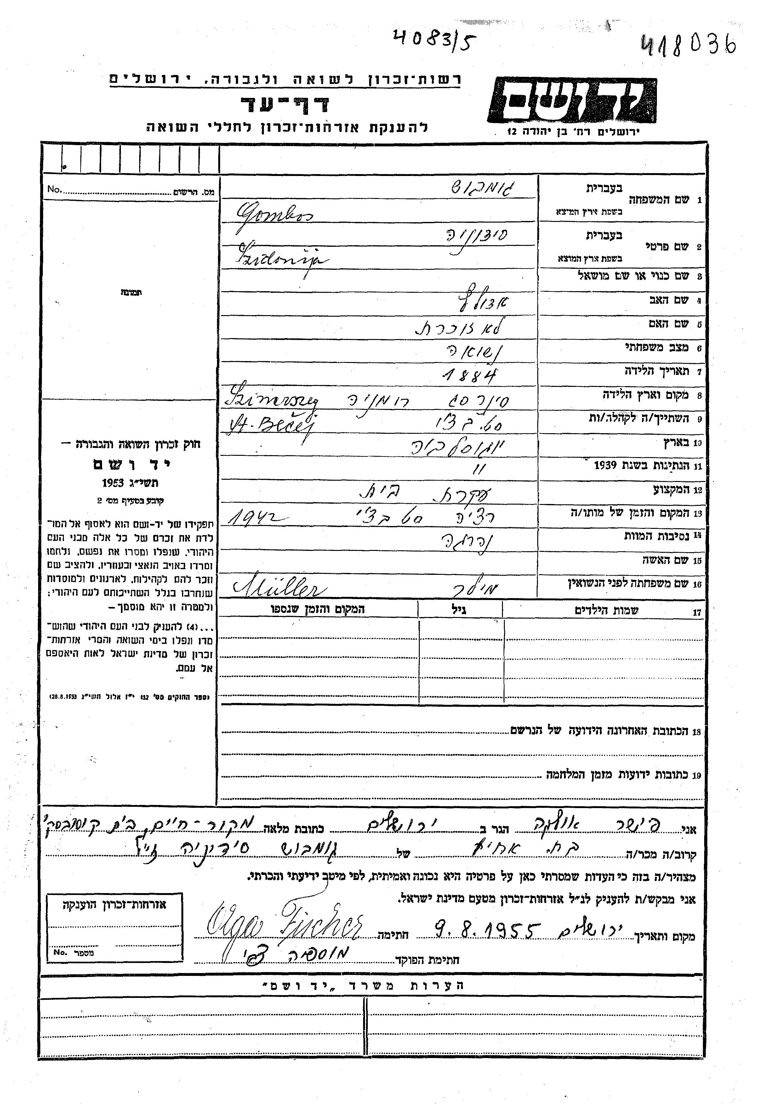 Szidonia Gombos apellido de soltera Miler nació en Szinerszeg, Rumania en 1884, hija de Adolf. Era Ama de casa. Antes de la segunda guerra mundial vivía en Stari Becej, Yugoslavia.