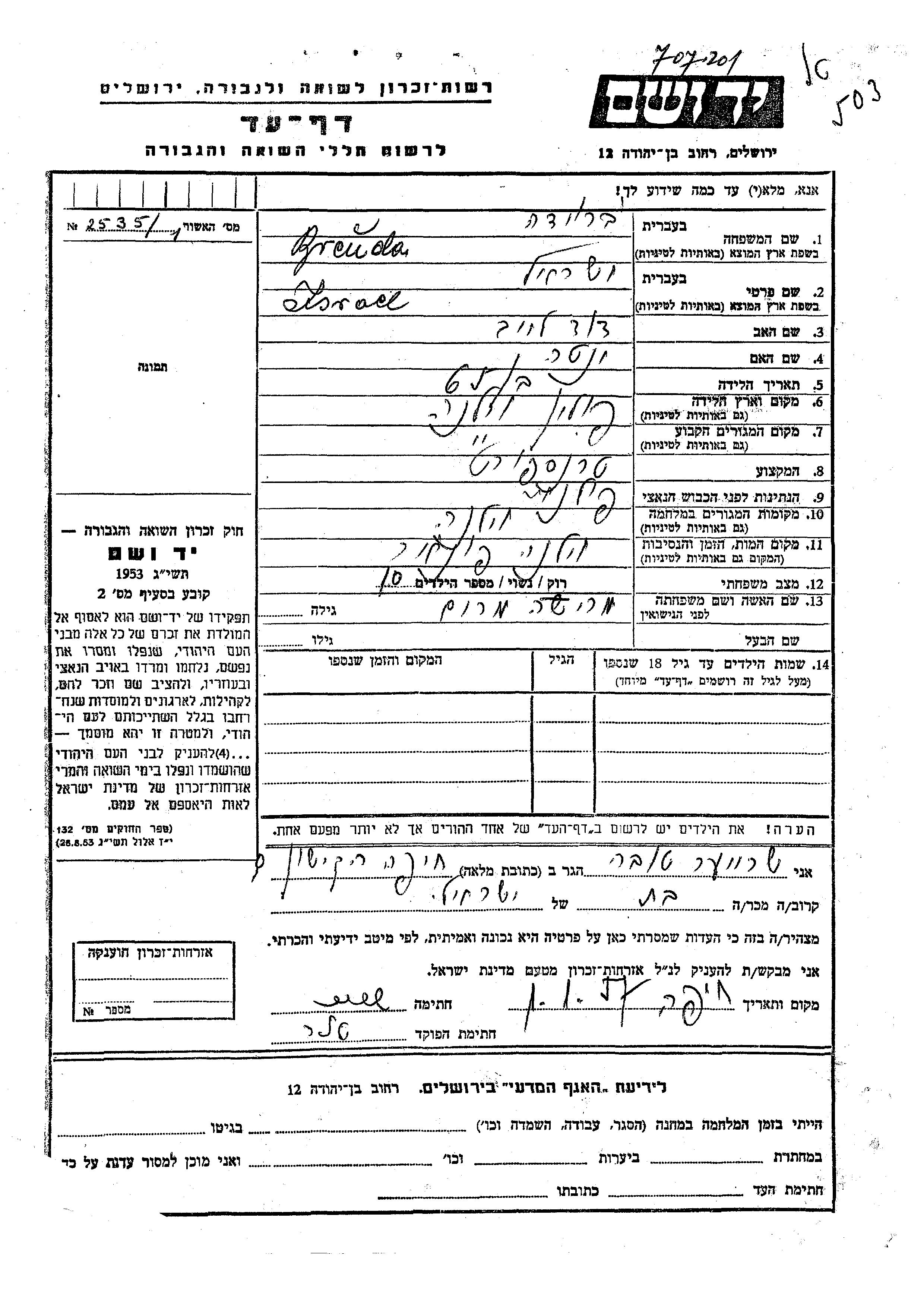 Breuda Israel Wilno, Polonia Hoja de Testimonio