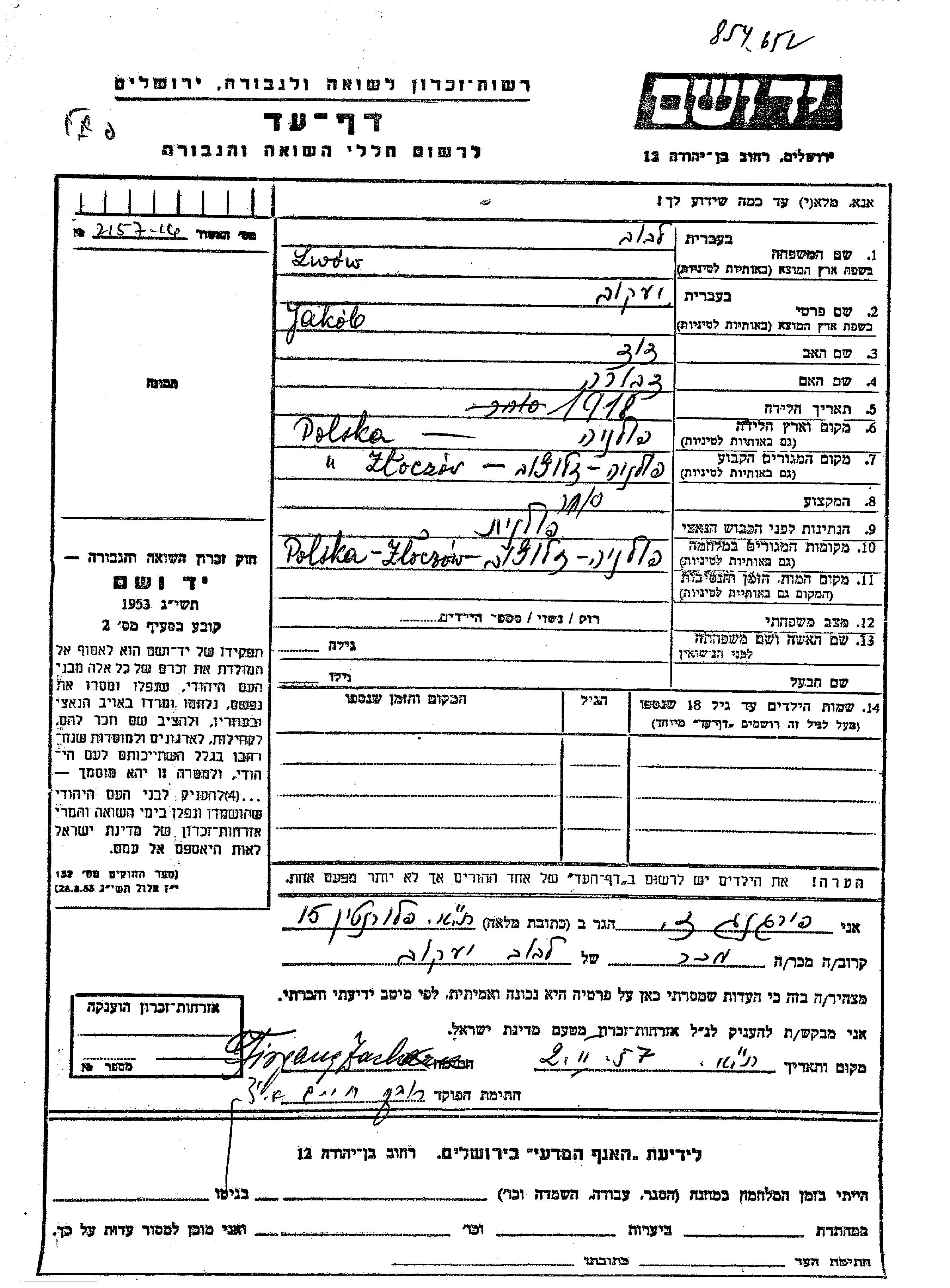 Lwow Jakob 1918 Zloczow, Polonia Hoja de Testimonio