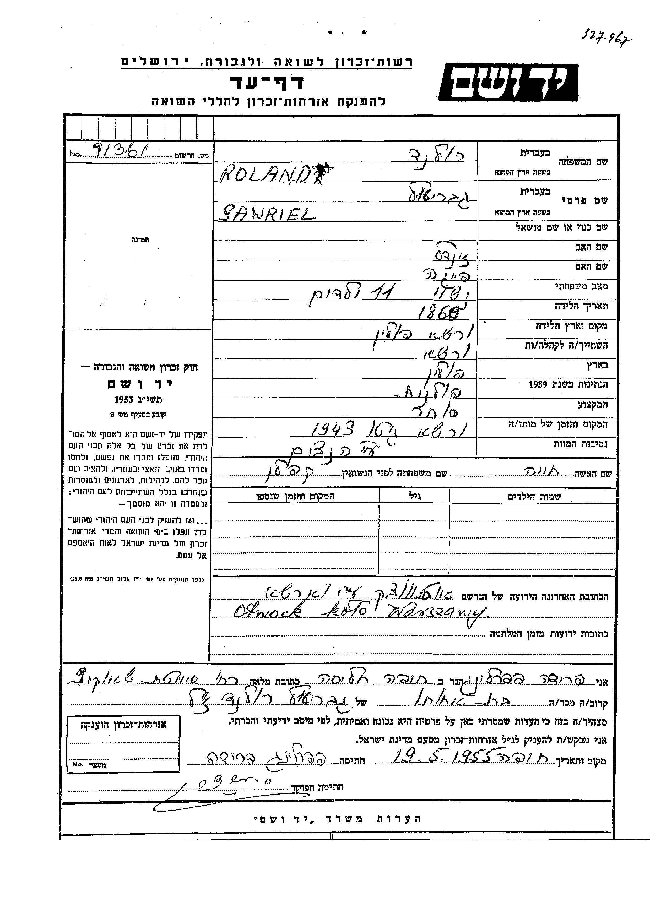 Gawriel Roland nació en Warszawa, Polonia en 1860, hijo de Zindel y Feiga. Era Comereciante. Antes de la segunda guerra mundial vivía en Warszawa, Polonia. Durante la guerra estuvo en Otwock, Polonia.