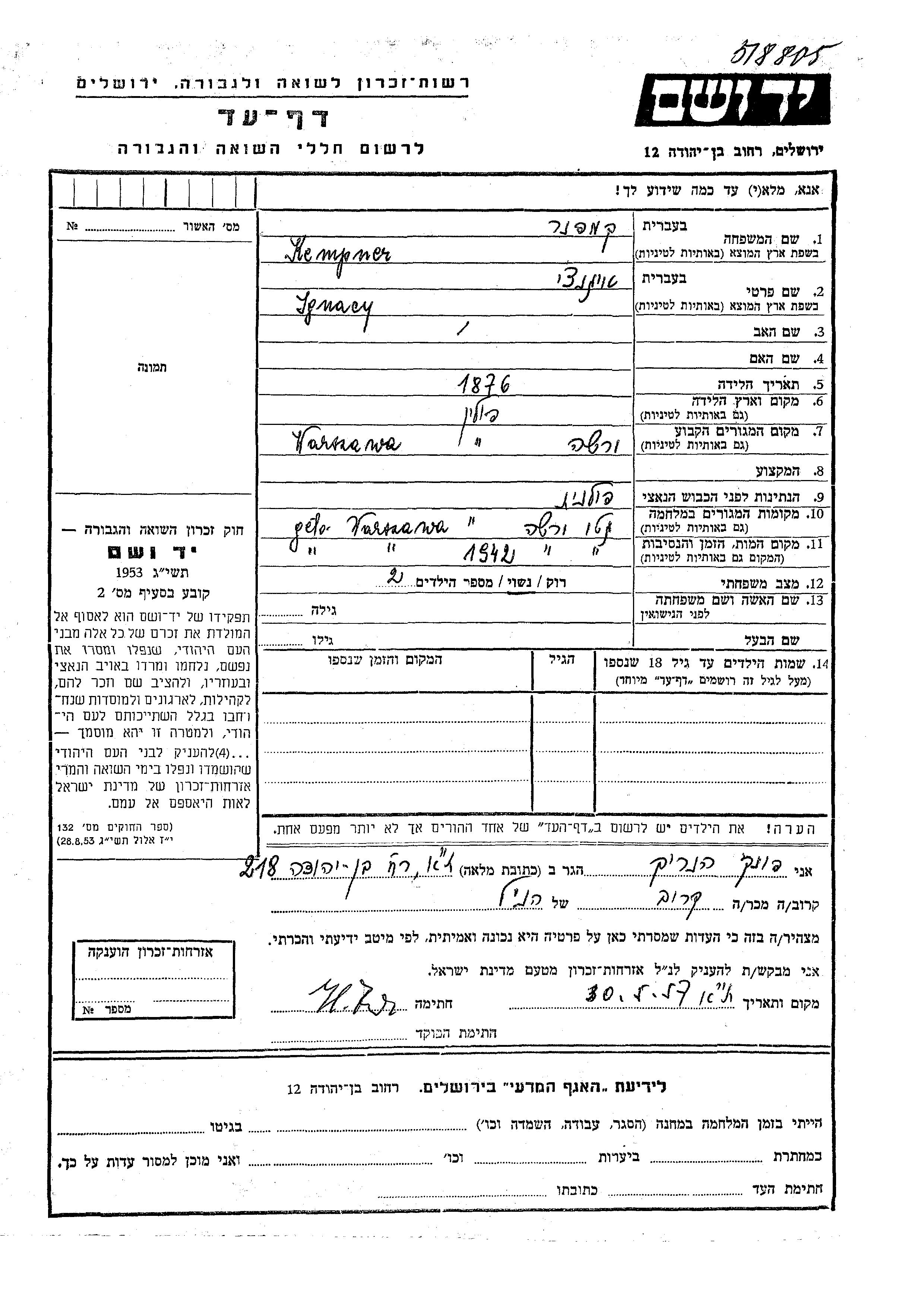 Ignacy fue asesinado durante la Shoá. Lugar de la muerte: Warsaw, Polonia en 1942.
