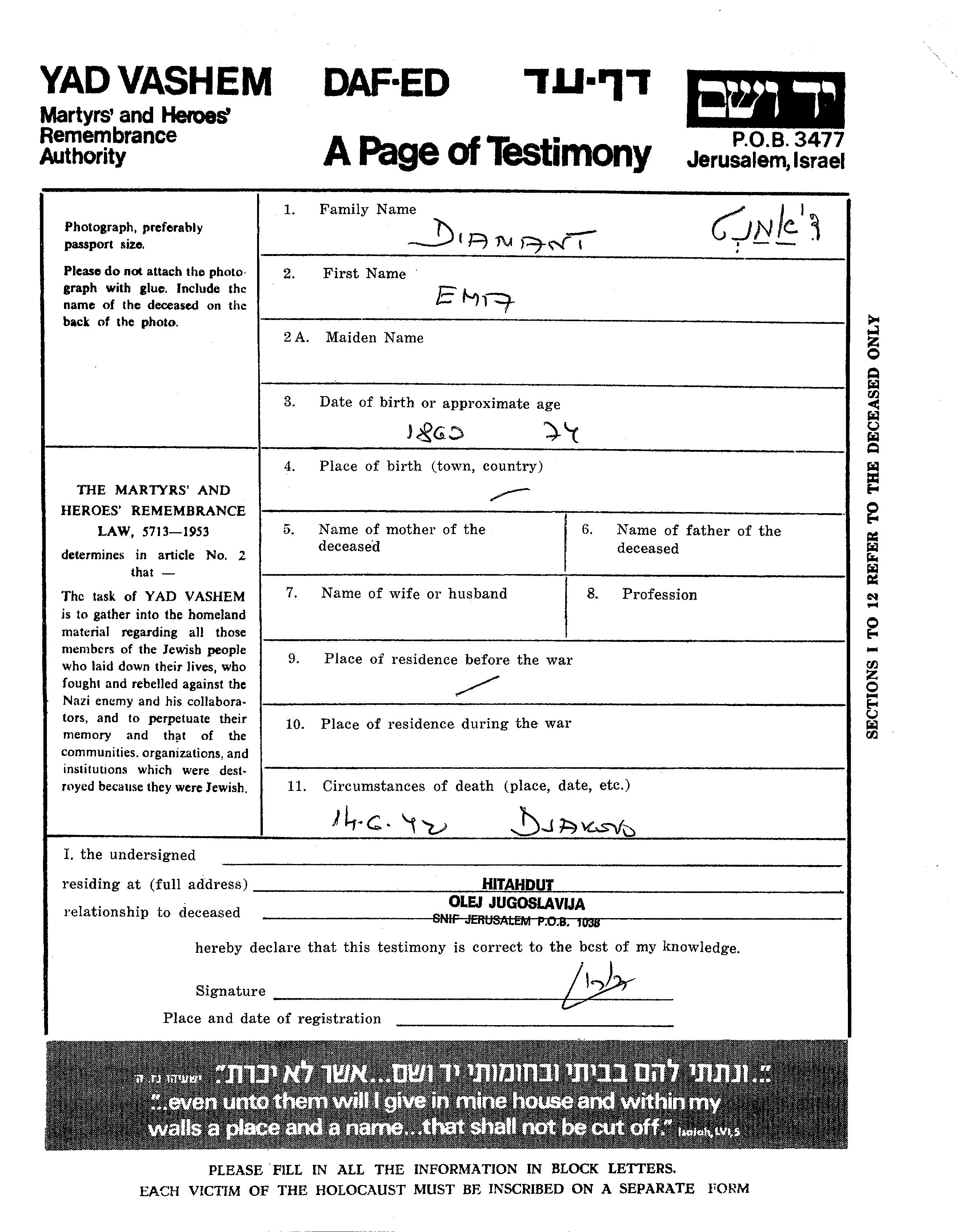 Ema fue asesinada durante la Shoá. Lugar de la muerte: Djakovo, Yugoslavia en 14/06/1942.