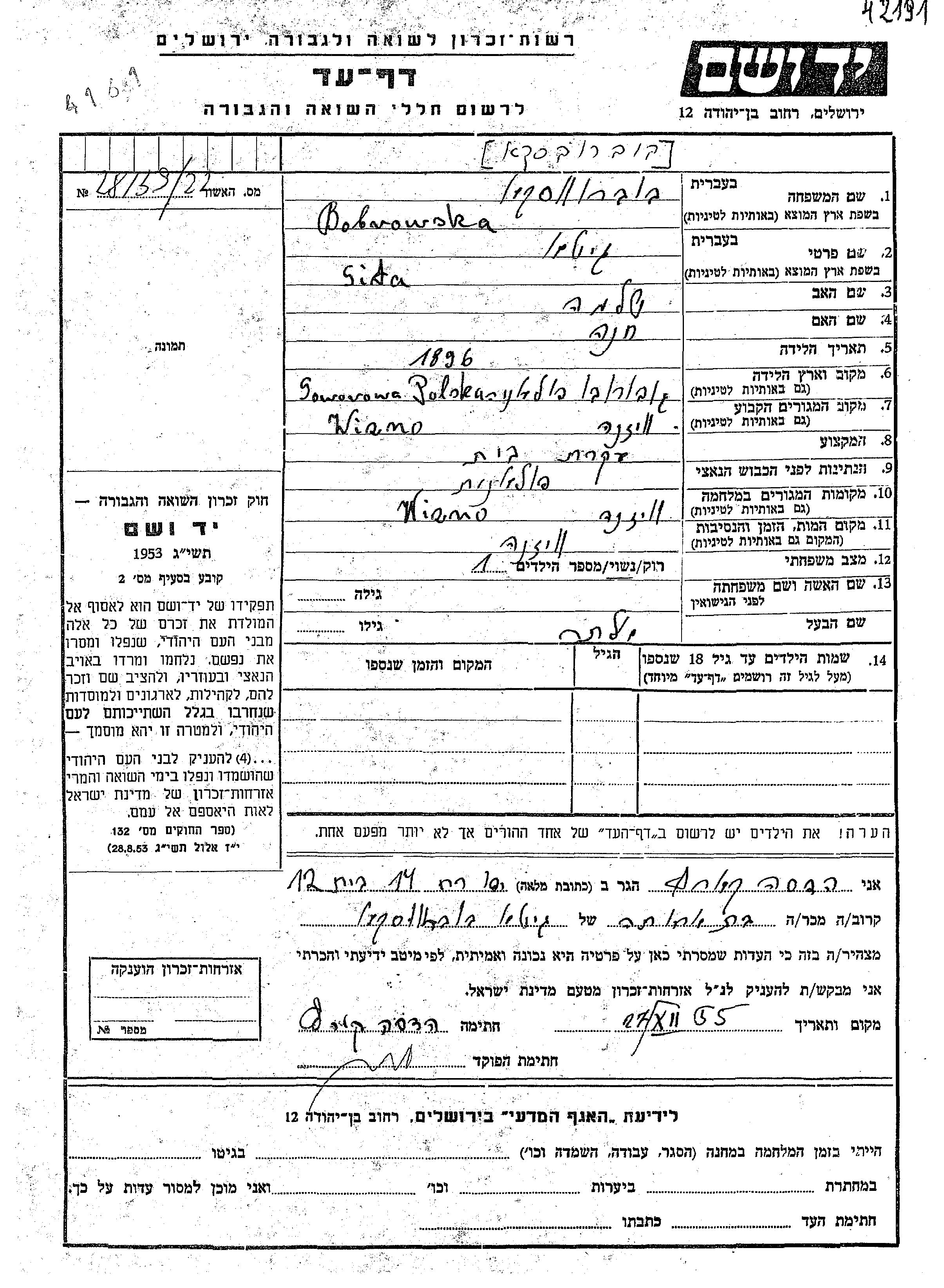 Bobrowska Gita 1896 Wizna, Polonia Hoja de Testimonio