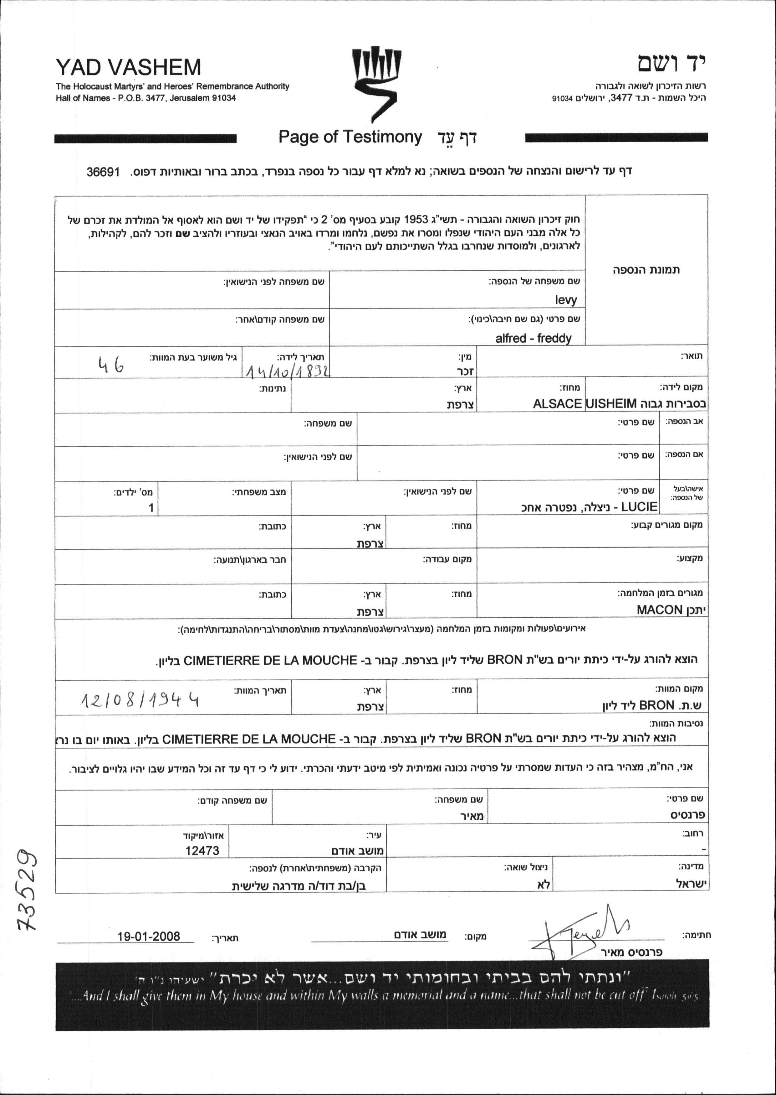 Alfred Freddy Levy nació en Reguisheim, Francia en 1892. Era Casado con Lucie. Antes de la segunda guerra mundial vivía en Francia. Durante la guerra estuvo en Macon, Francia. Alfred Freddy fue asesinado durante la Shoá. Lugar de la muerte: Lyon, Francia en 12/08/1944.