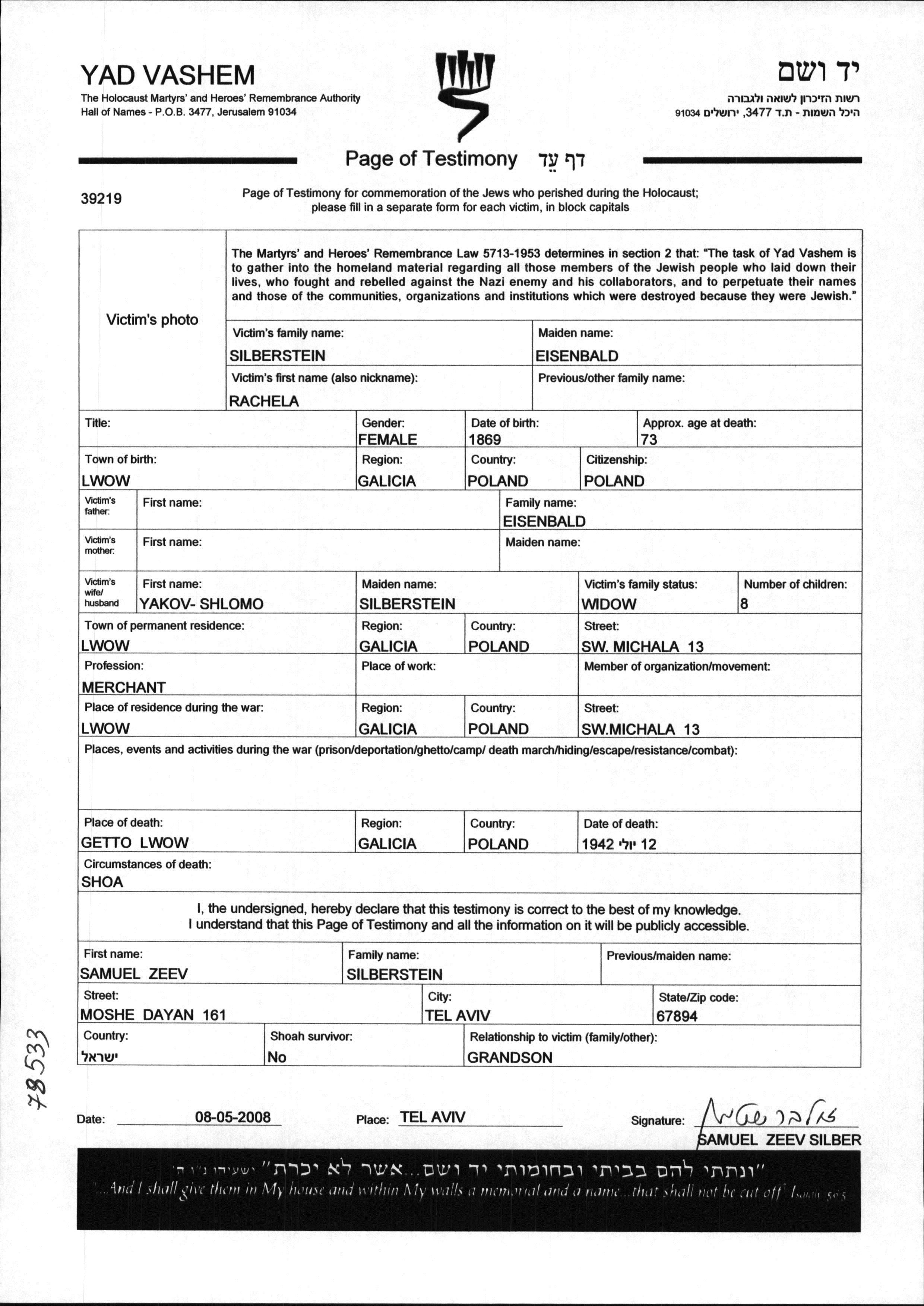 Rachela Silberstein apellido de soltera Eisenbald nació en Lwow, Polonia en 1869. Era Comereciante y Viuda con Yakov Shlomo apellido de soltera Silberstein. Antes de la segunda guerra mundial vivía en Lwow, Polonia. Durante la guerra estuvo en Lwow, Polonia. Rachela fue asesinada durante la Shoá. Lugar de la muerte: Lwow, Polonia en 12/07/1942.