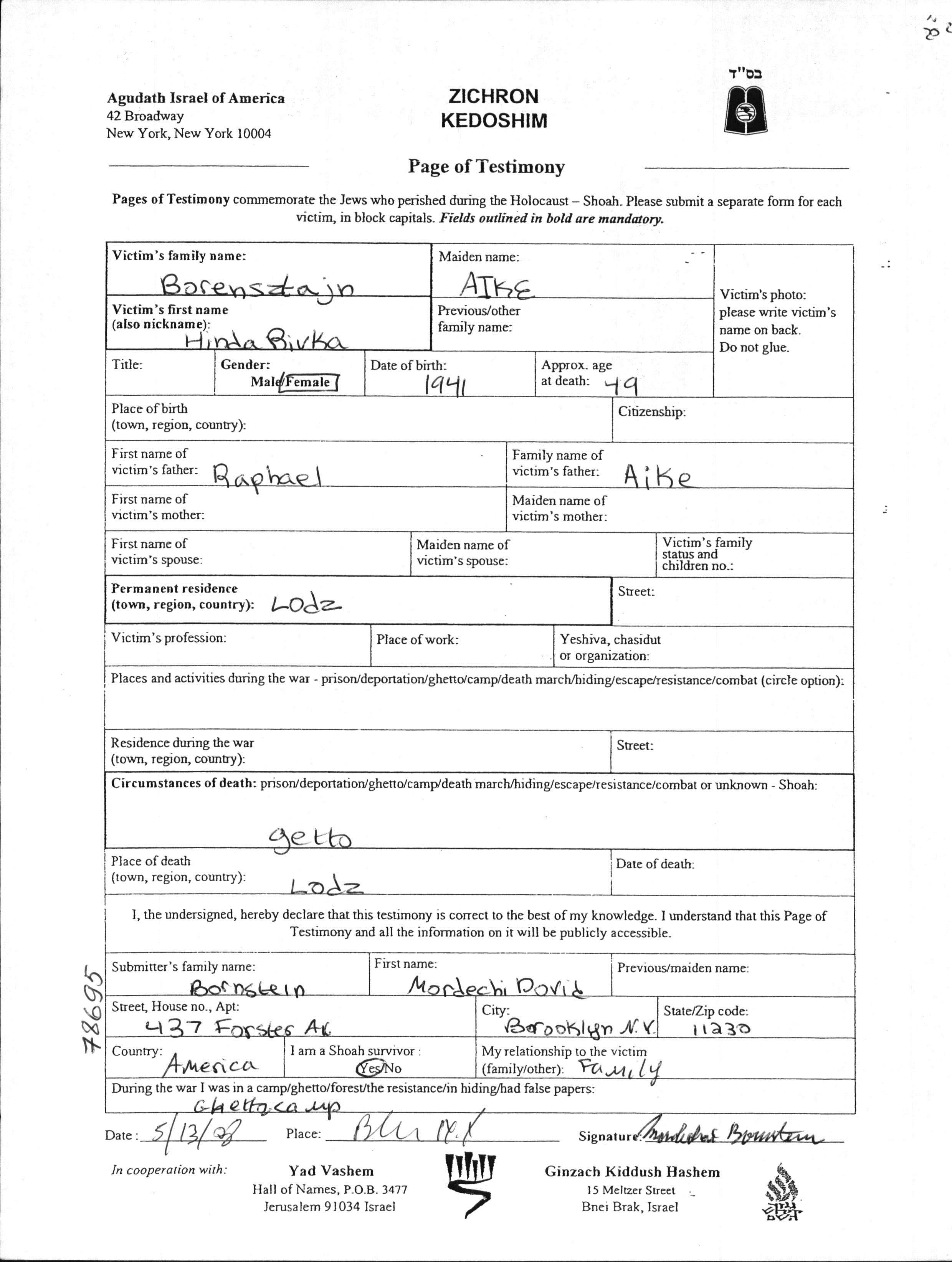 Borensztajn Hinda Rivka Lodz, Polonia Hoja de Testimonio