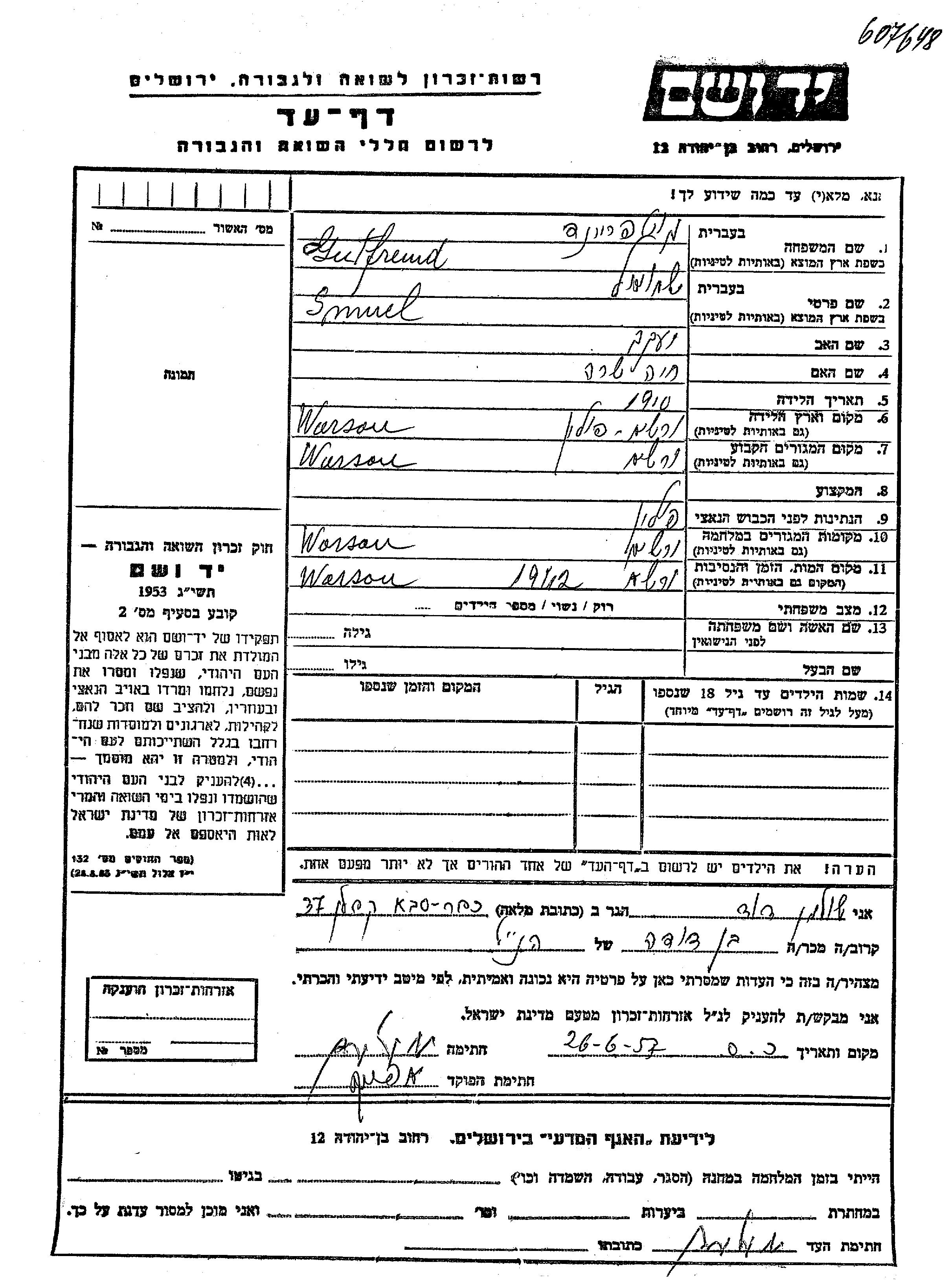 Smuel Gutfreund nació en Warsaw, Polonia en 1910, hijo de Yaakov y Khaia Sara. Antes de la segunda guerra mundial vivía en Warsaw, Polonia. Durante la guerra estuvo en Warsaw, Polonia.