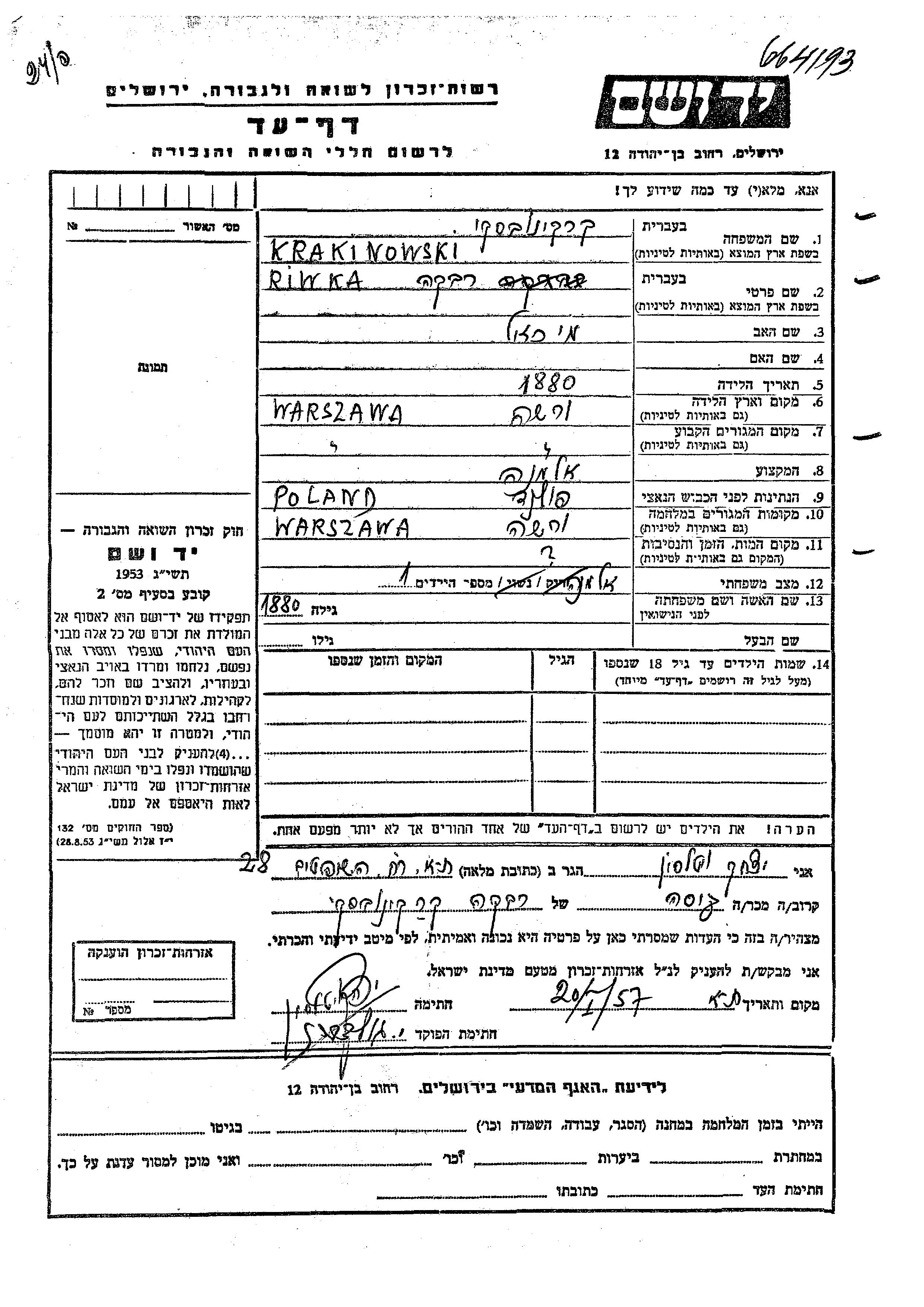 Riwka Krakinowski nació en Varsha, Polonia en 1880, hija de Mikhael. Era Viuda. Antes de la segunda guerra mundial vivía en Varsha, Polonia. Durante la guerra estuvo en Warszawa, Polonia.