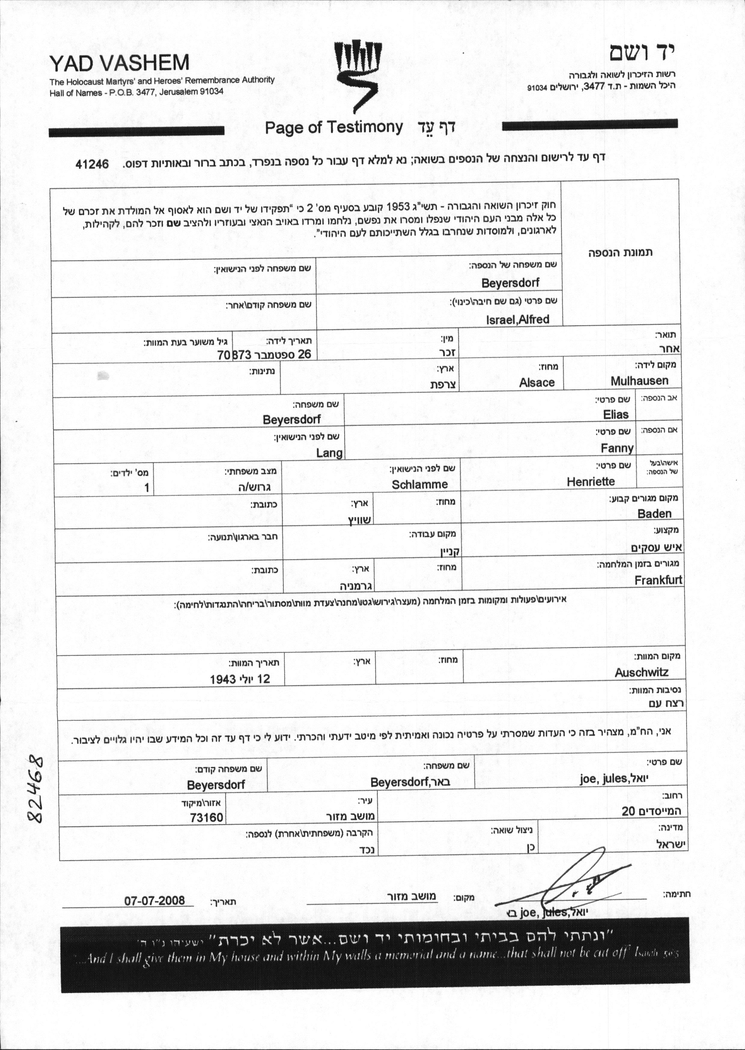 Alfred Israel Beyersdorf nació en Muelhausen, Francia en 1873, hijo de Elias y Fanny apellido de soltera Lang. Era Hombre de negocios y divorciado con Henriette apellido de soltera Schlamme. Antes de la segunda guerra mundial vivía en Baden, Suiza. Durante la guerra estuvo en Frankfurt am Main, Alemania. Alfred Israel fue asesinado durante la Shoá. Lugar de la muerte: Auschwitz, Polonia en 12/07/1943.