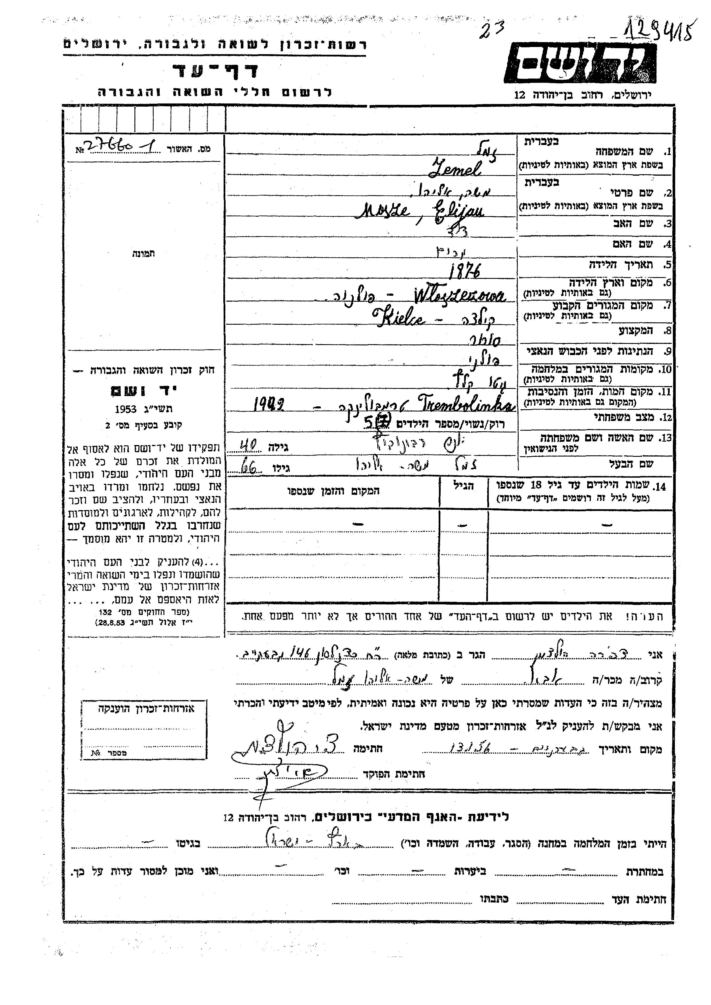 Mosze Elijau Zemel nació en Wloszczowa, Polonia en 1876, hijo de David y Miriam. Era Comereciante y Casado con Yona apellido de soltera Rabinovitz. Antes de la segunda guerra mundial vivía en Kielce, Polonia. Durante la guerra estuvo en Kielce, Polonia.