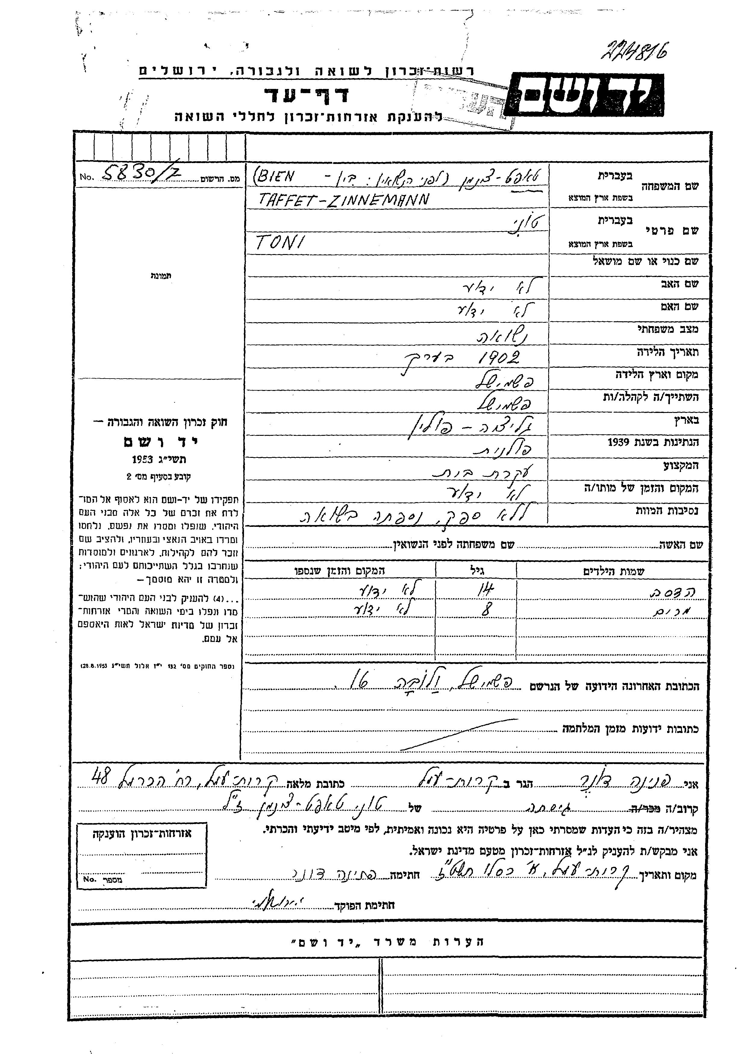 Toni Taffet Zinnemann apellido de soltera Bien nació en Przemysl, Polonia en 1902. Era Ama de casa y casada. Antes de la segunda guerra mundial vivía en Galicia Region, Polonia.