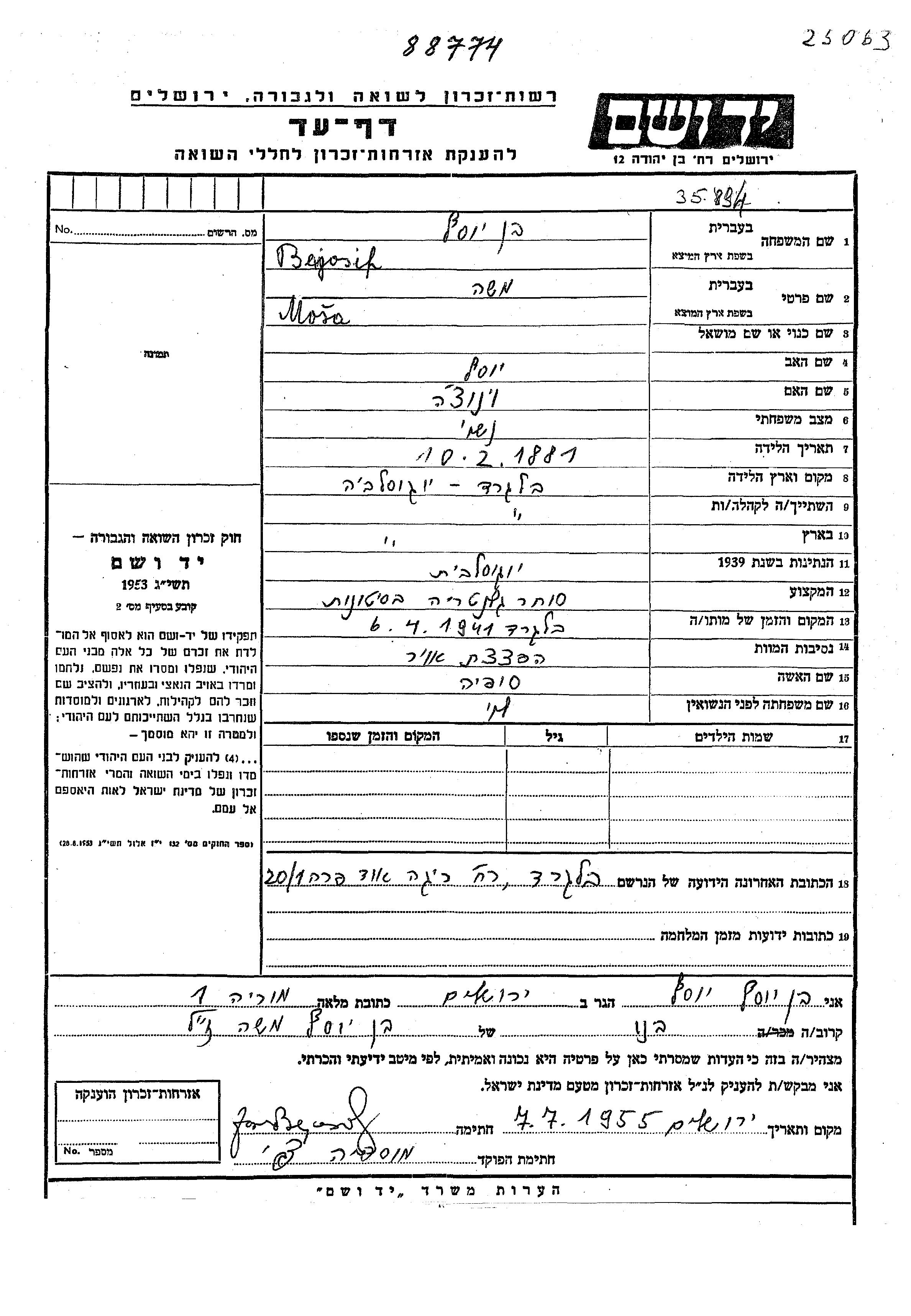 Bejosif Ben Yosef Mosa 1881 Belgrad, Yugoslavia Hoja de Testimonio
