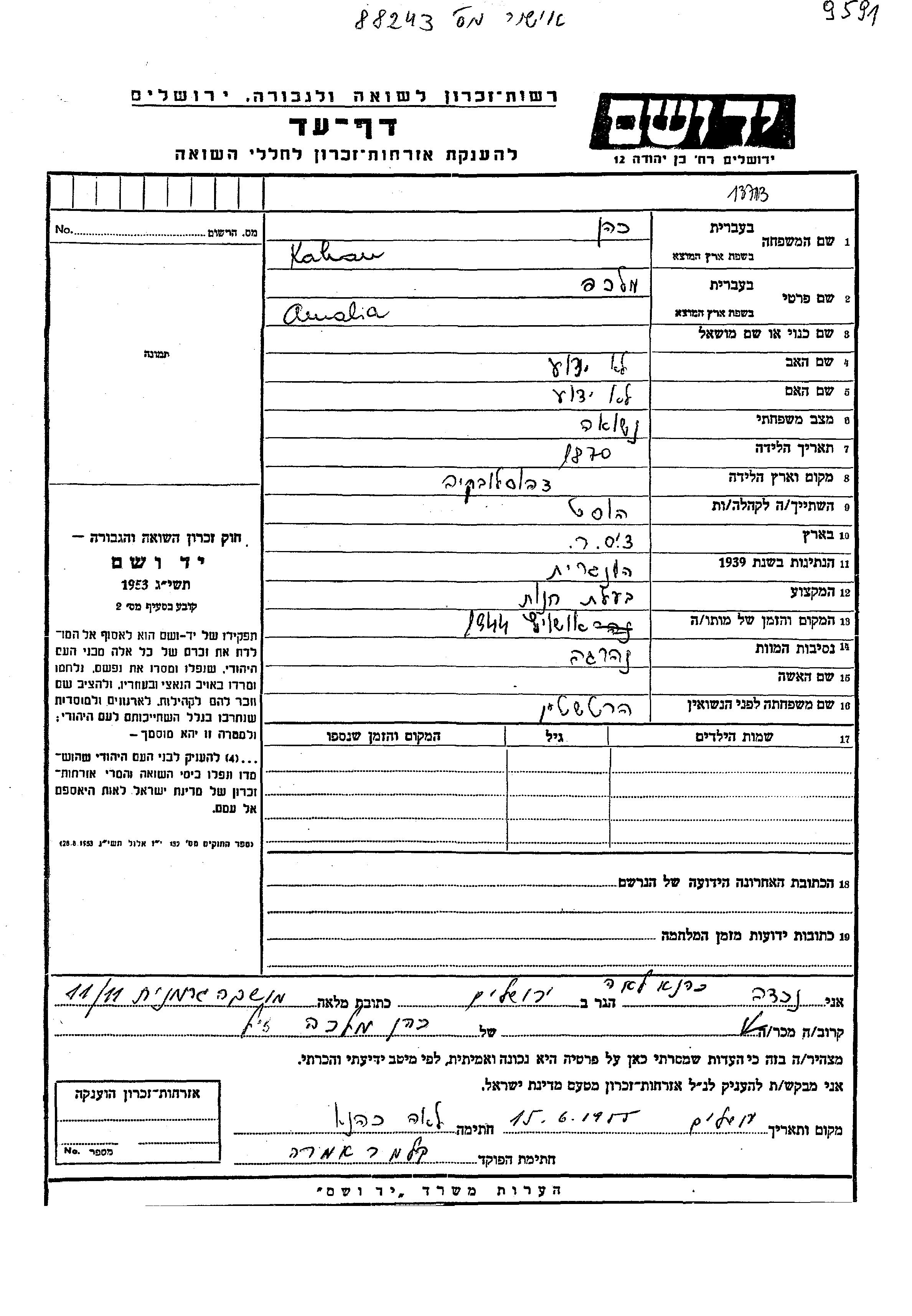 Kahan Amalia Malka 1870 Host, Checoslovaquia Hoja de Testimonio