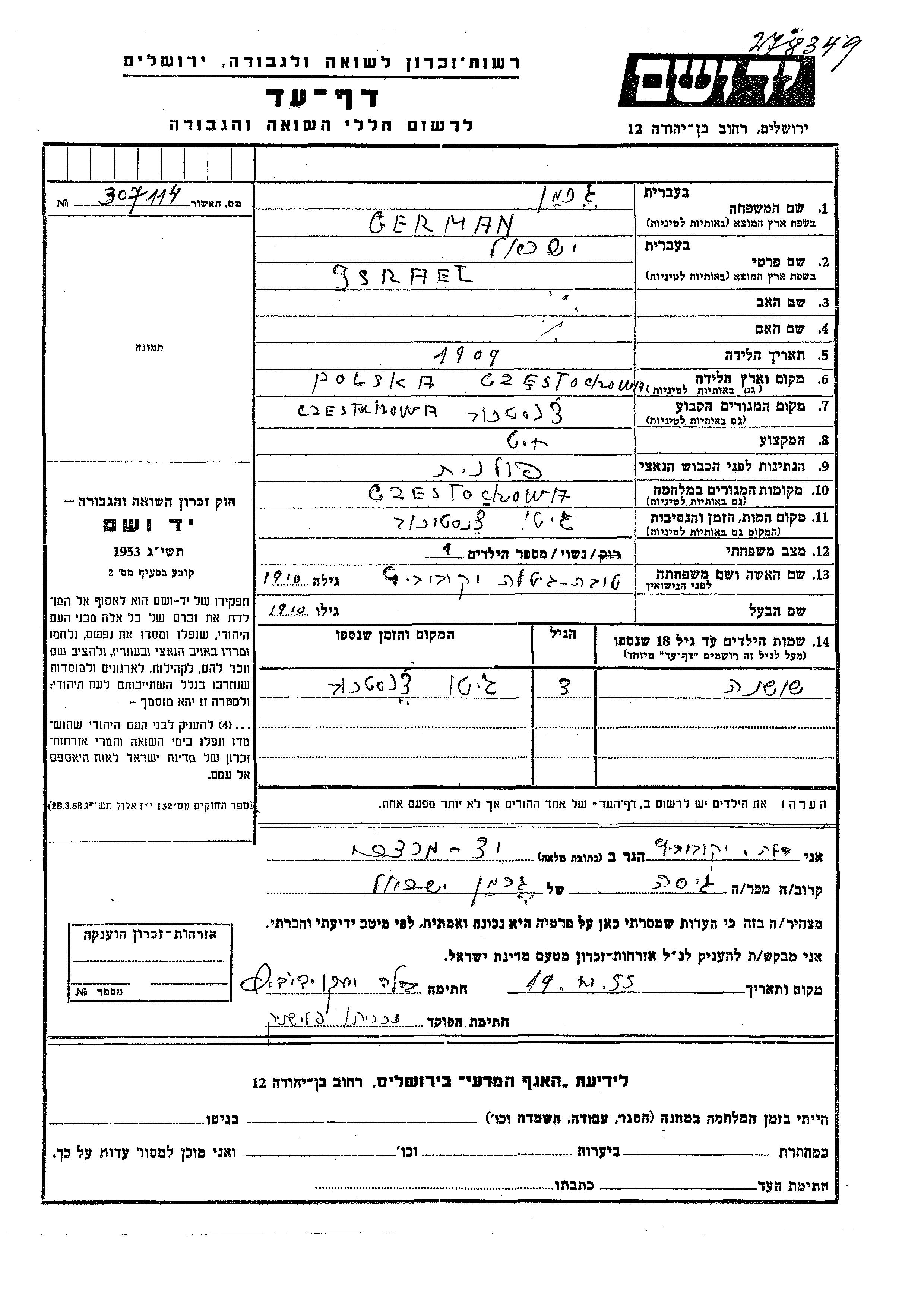 Israel German nació en Czestochowa, Polonia en 1909. Era Sastre y Casado con Tova Gitla apellido de soltera Yakubovich. Antes de la segunda guerra mundial vivía en Czestochowa, Polonia. Durante la guerra estuvo en Czestochowa, Polonia.
