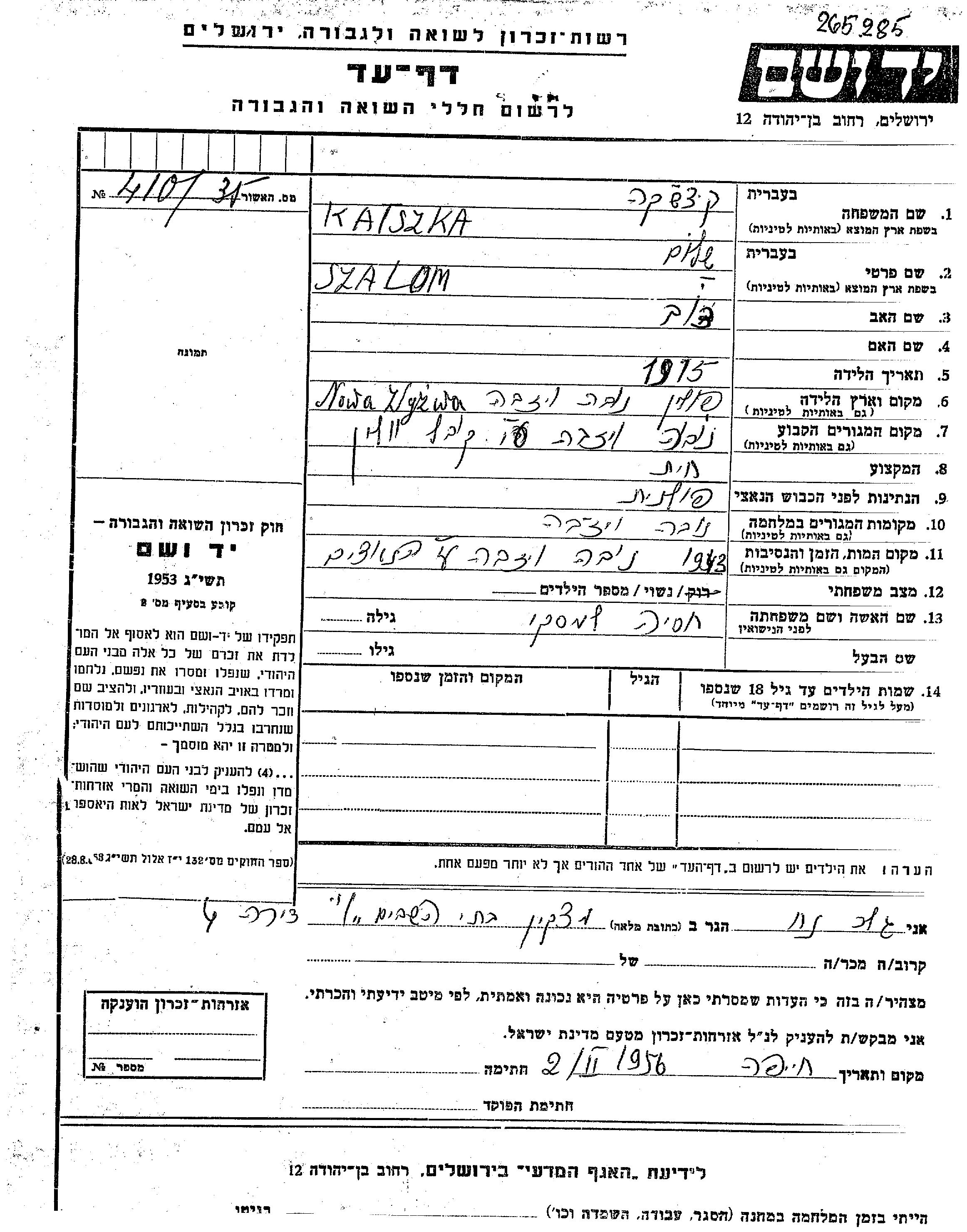 Szalom Katszka nació en Nowa Wizwa, Polonia en 1915, hijo de Dov. Era Sastre y Casado con Khasia apellido de soltera Lamaski. Antes de la segunda guerra mundial vivía en Nowa Wizwa, Polonia. Durante la guerra estuvo en Nowa Wizwa, Polonia.