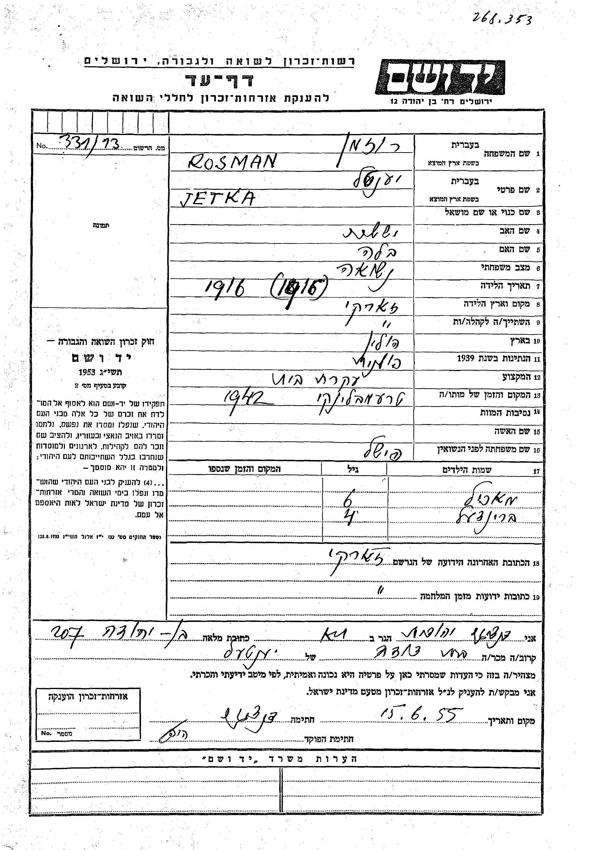 Jetka Yentel Rosman Rozman nació en Zarki, Polonia en 1916, hija de Issakhar y Bela. Era Ama de casa y casada con Fishel. Antes de la segunda guerra mundial vivía en Zarki, Polonia. Durante la guerra estuvo en Zarki, Polonia.