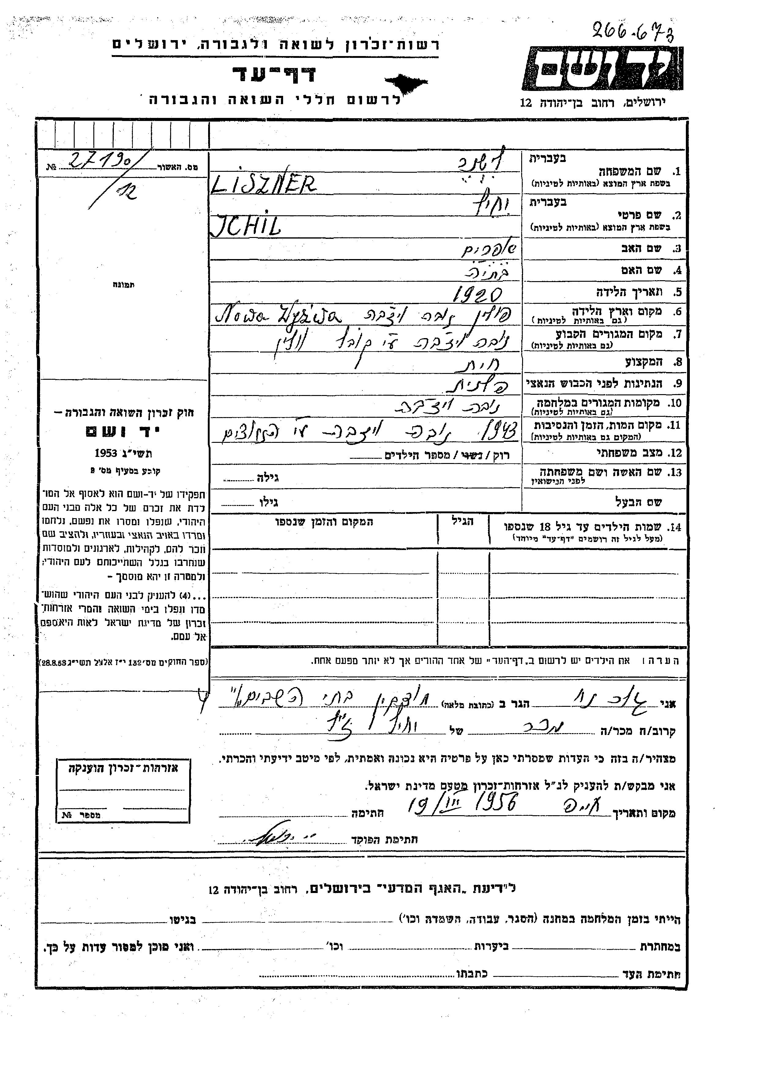 Jchil Liszner nació en Nova Vizhva, Polonia en 1920, hijo de Efraim y Batia. Era Sastre y Soltero. Antes de la segunda guerra mundial vivía en Nova Vizhva, Polonia. Durante la guerra estuvo en Nova Vizhva, Polonia.