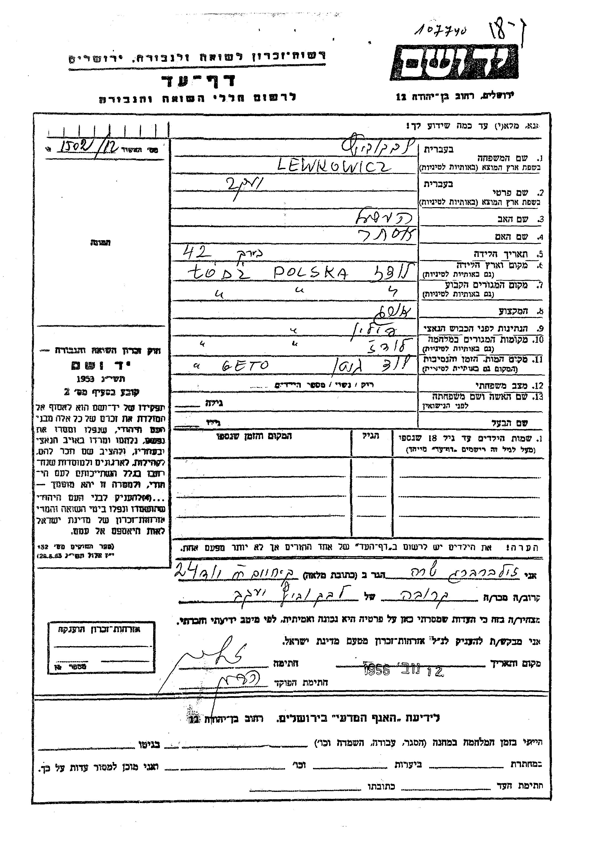 Lewkowicz Yaakov Lodz, Polonia Hoja de Testimonio