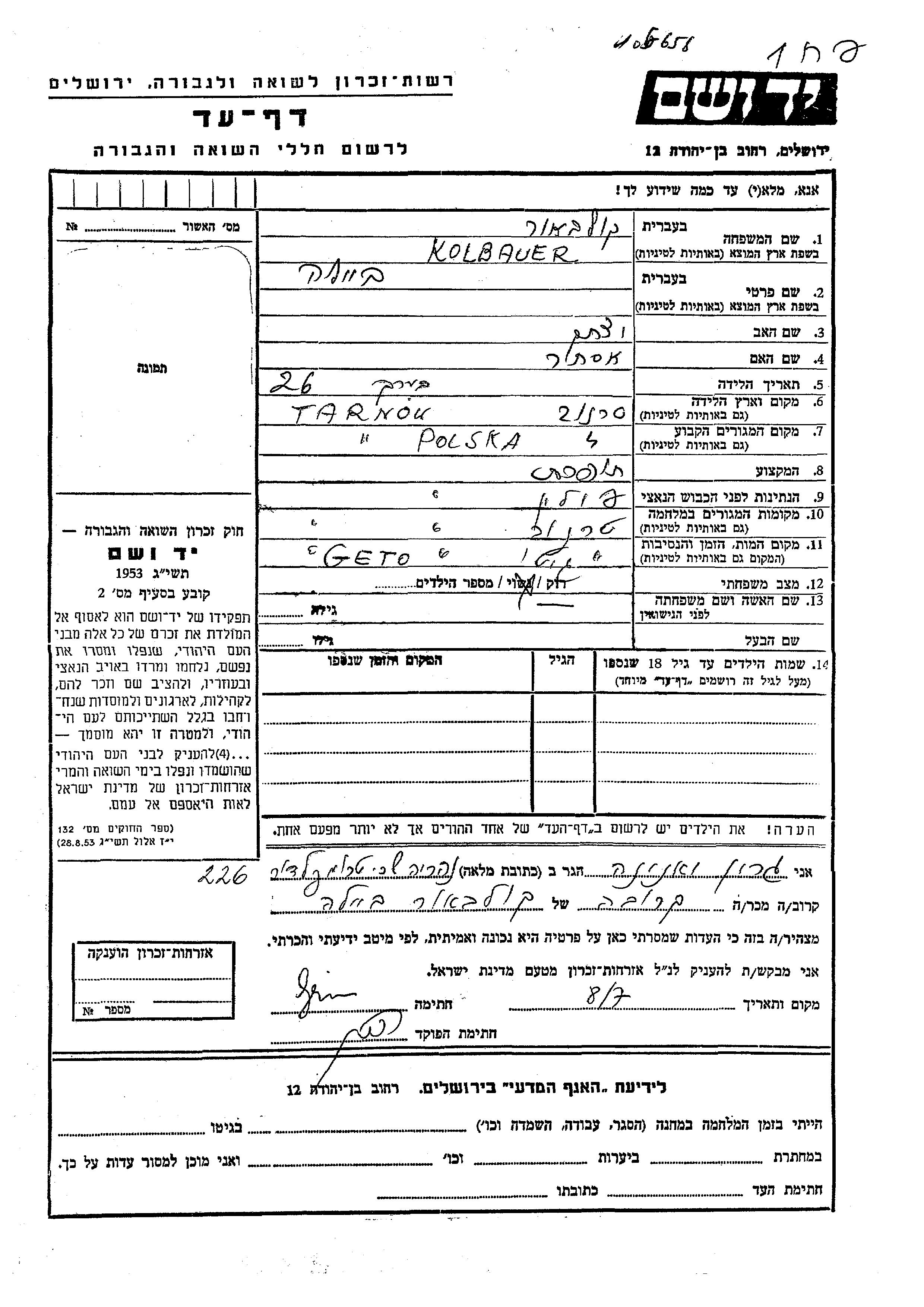 Kohlbauer Beila Tarnow, Polonia Hoja de Testimonio