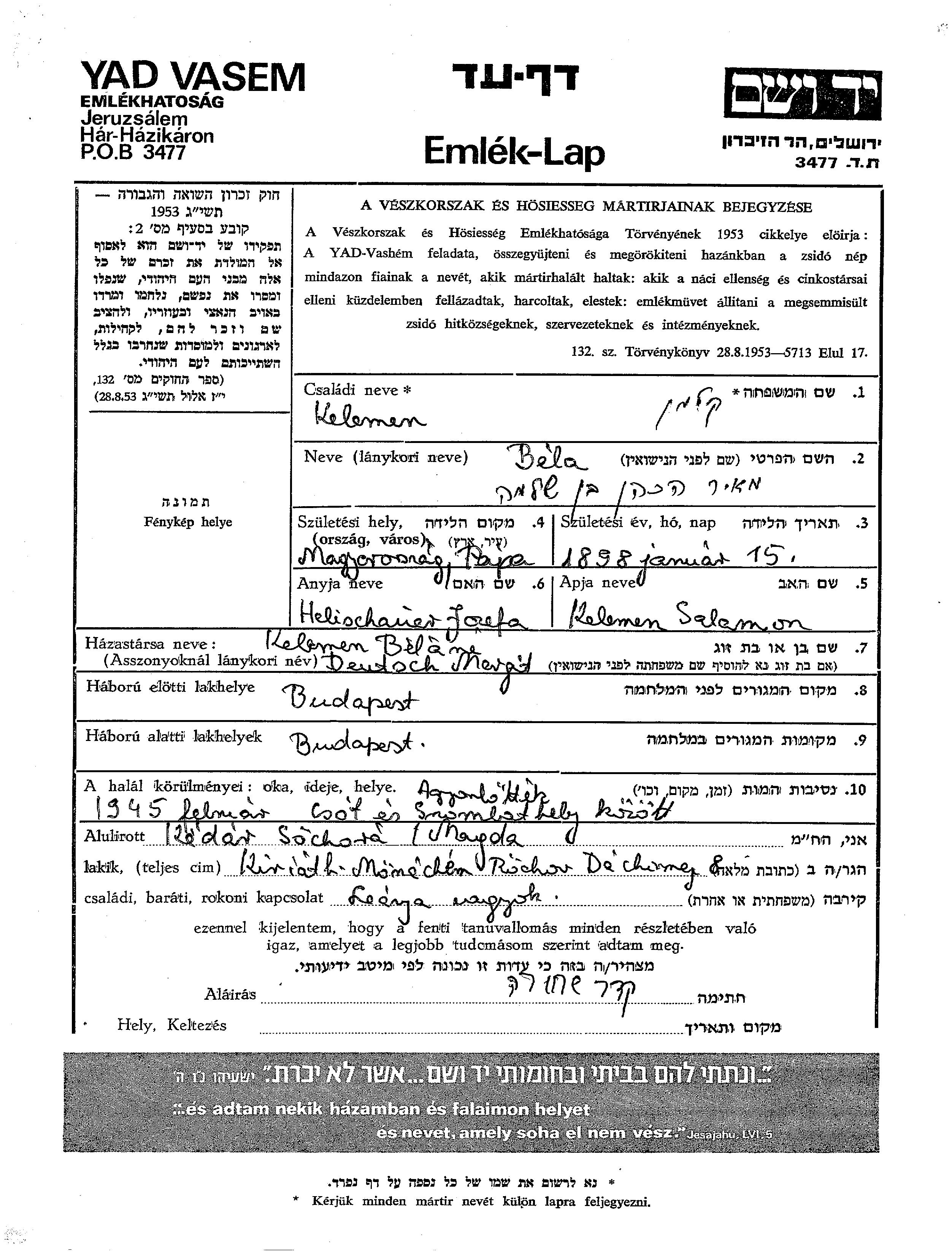 Kelemen Kalman Kohen Bela Meir 1898 Budapest, Hungría Hoja de Testimonio
