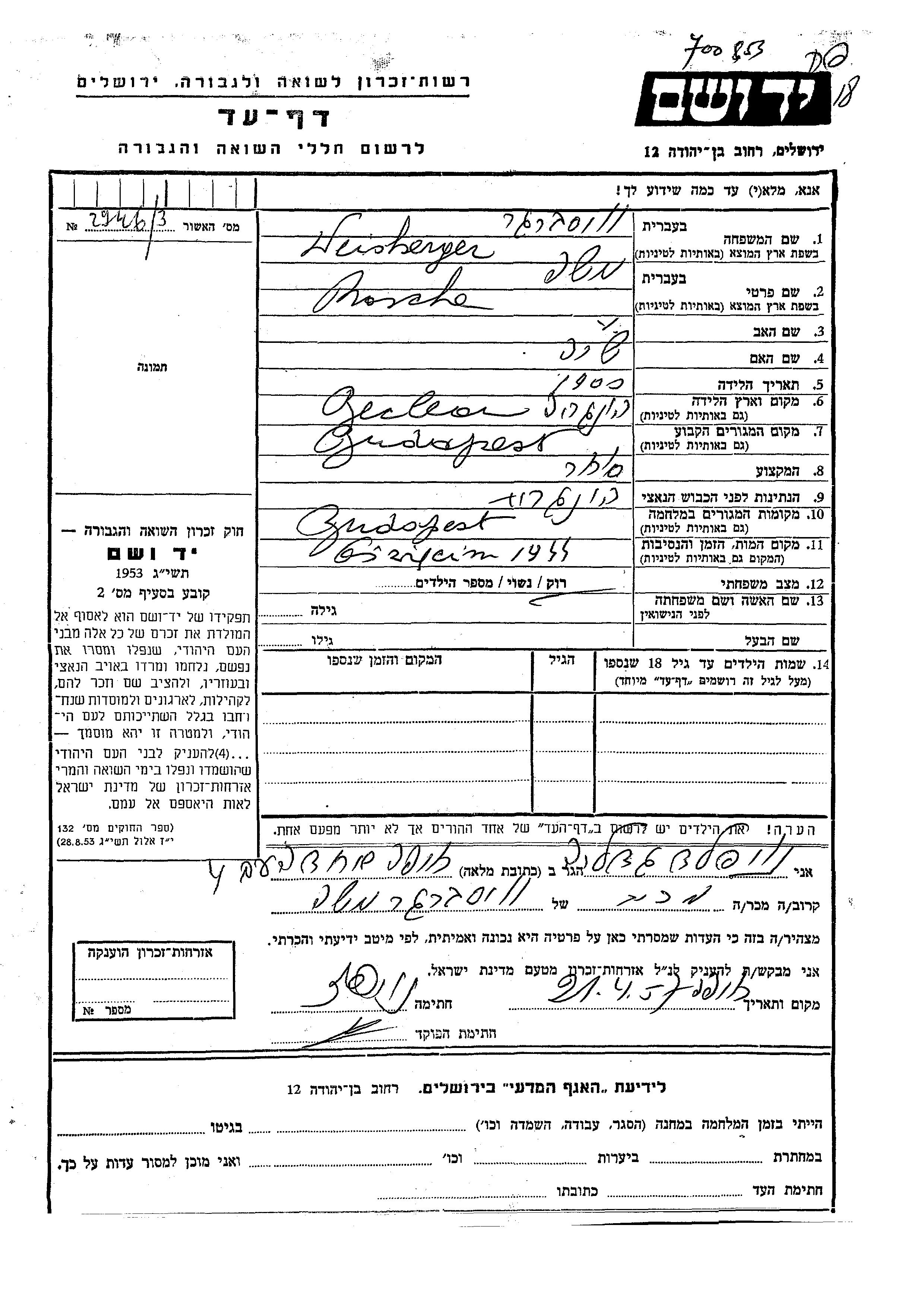Weisberger Mosche 1900 Budapest, Hungría Hoja de Testimonio