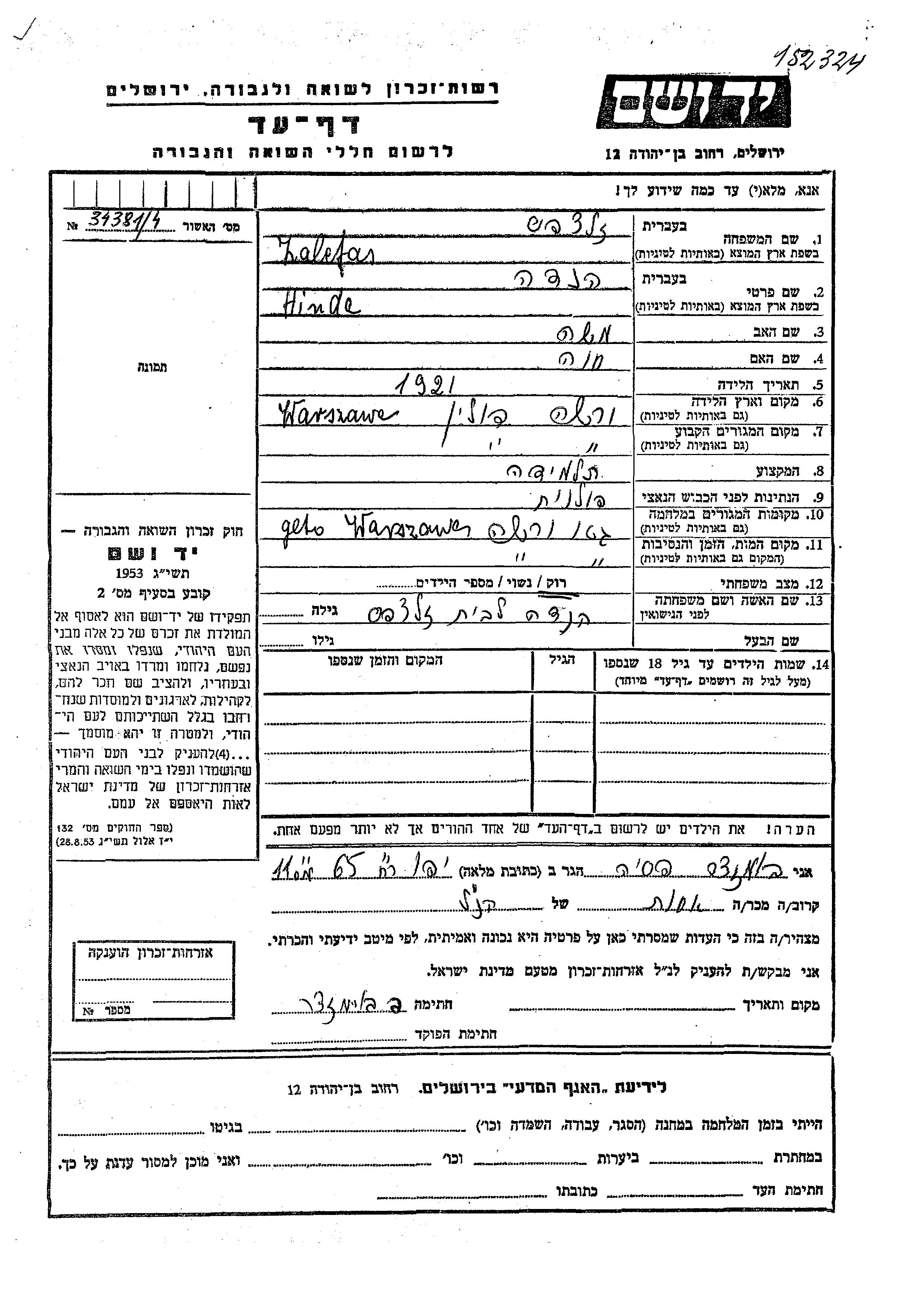 Zalcfas Hinde 1921 Warszawa, Polonia Hoja de Testimonio