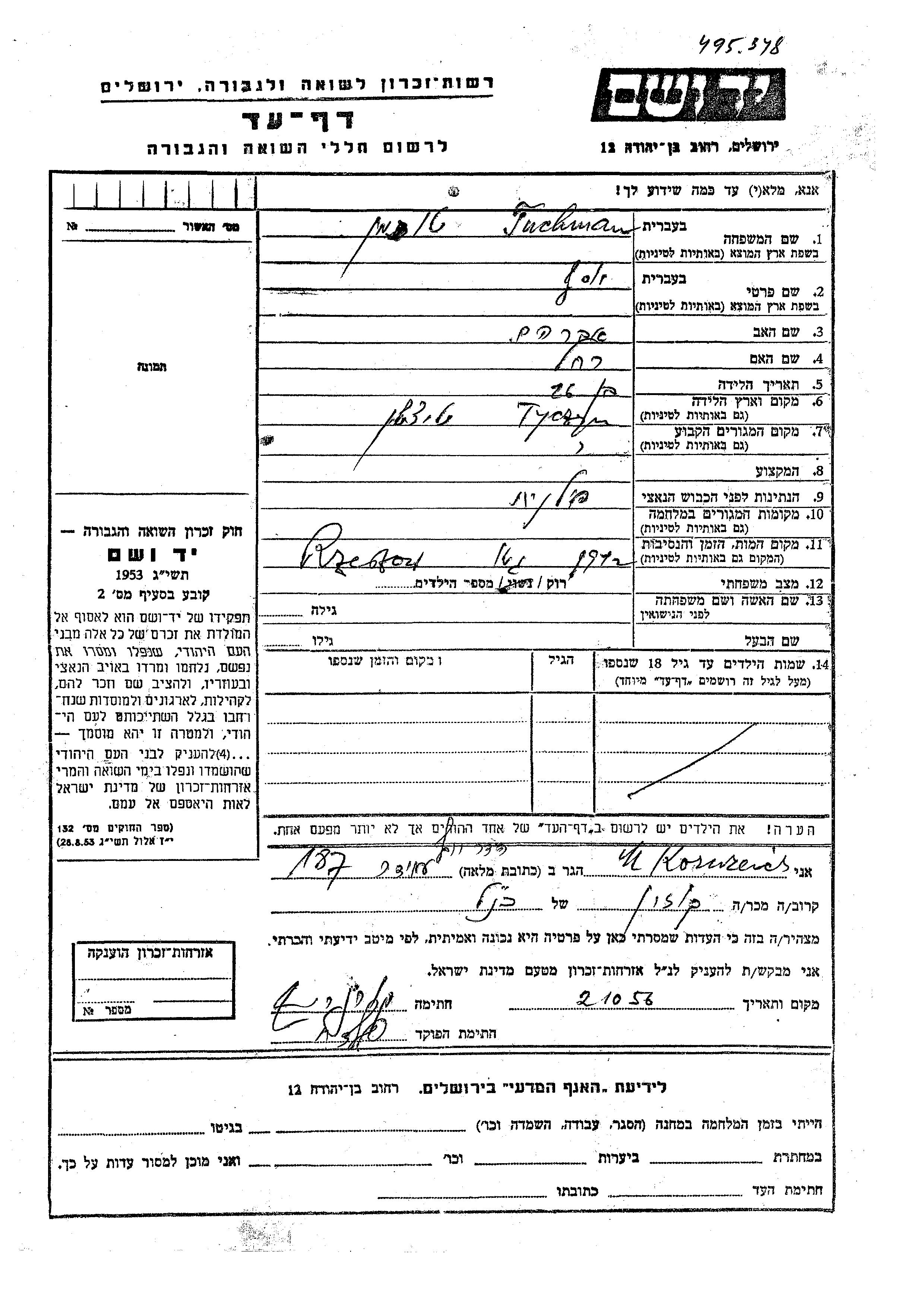 Tuchman Yosef Tyczyn, Polonia Hoja de Testimonio