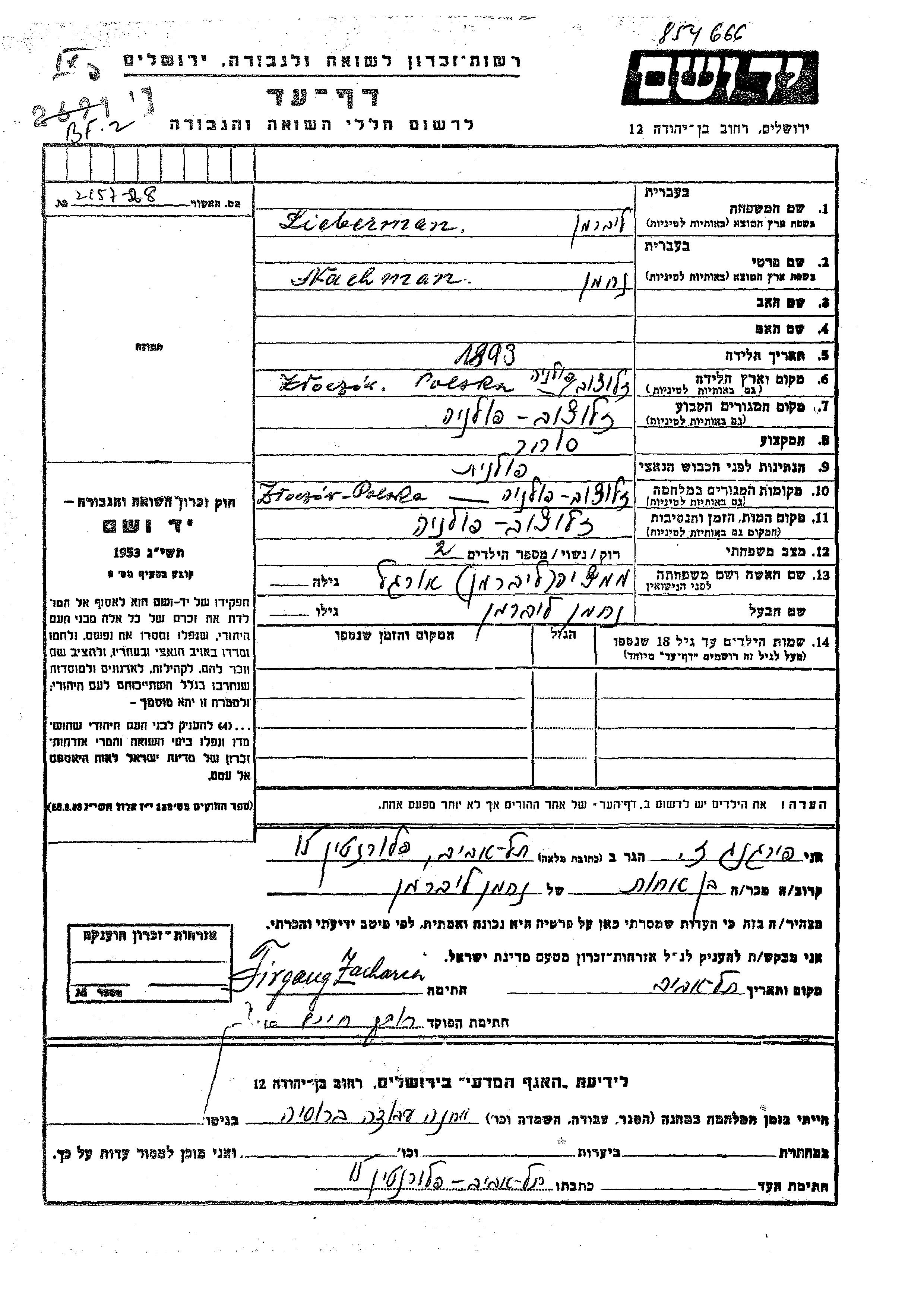 Nachman Lieberman nació en Zloczow, Polonia en 1893. Era Comereciante y Casado con Mamtzia apellido de soltera Orgal. Antes de la segunda guerra mundial vivía en Zloczow, Polonia. Durante la guerra estuvo en Zloczow, Polonia.
