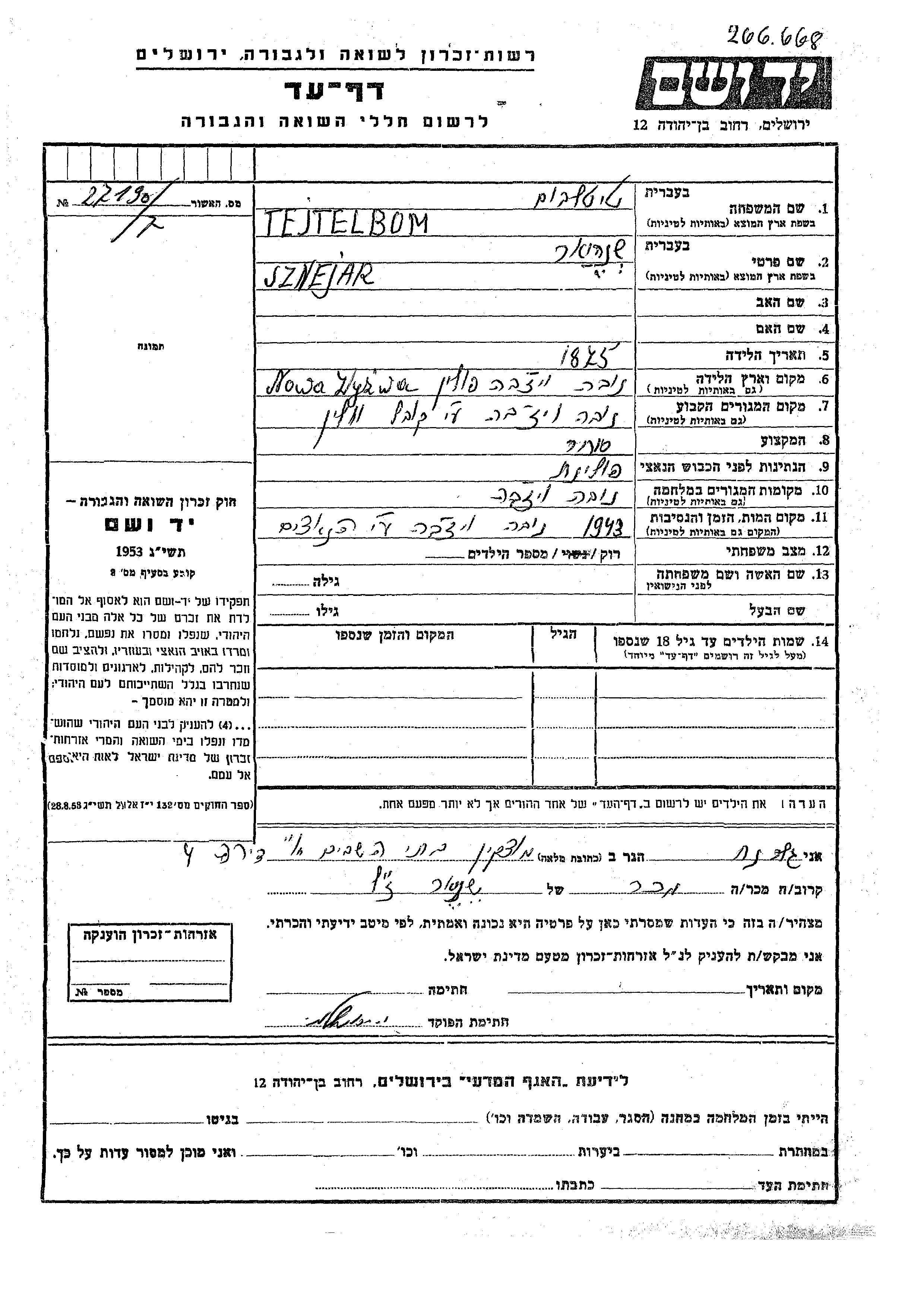 Sznejar Tejtelbom nació en Nowa Wizwa, Polonia en 1875. Era Comereciante y Soltero. Antes de la segunda guerra mundial vivía en Nowa Wizwa, Polonia. Durante la guerra estuvo en Nowa Wizwa, Polonia.