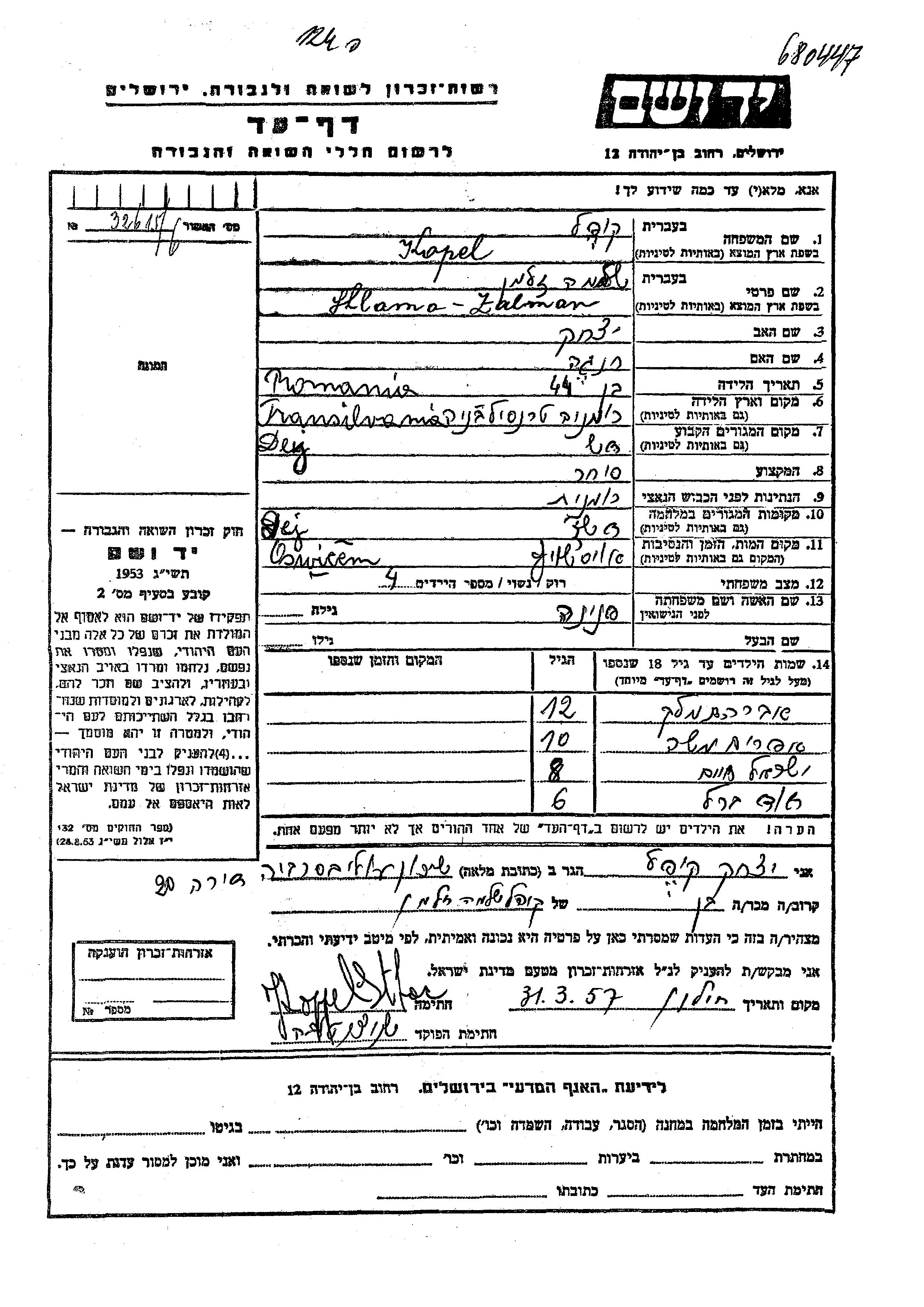 Kopel David Berl Dej, Rumania Hoja de Testimonio
